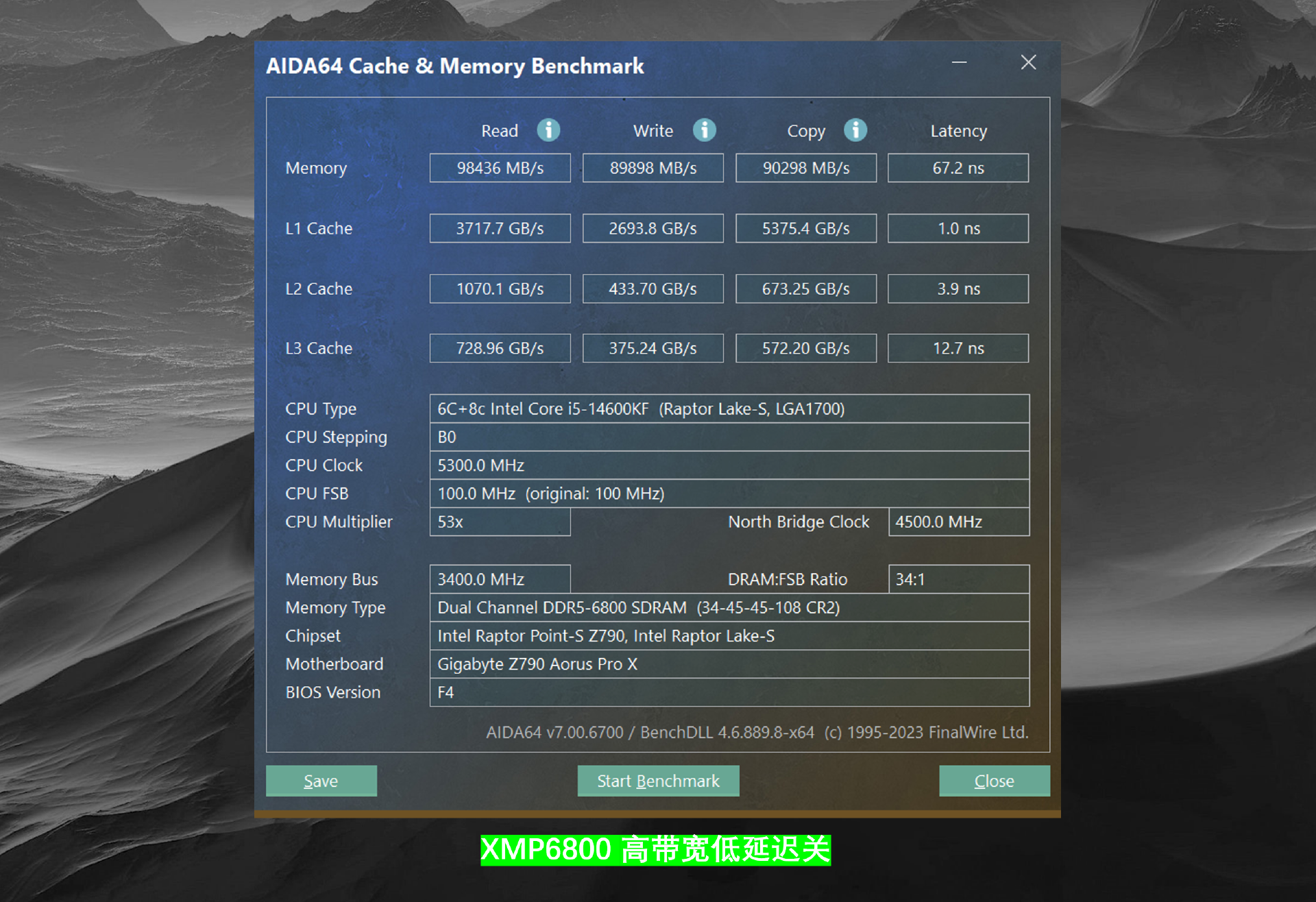 可以看到开启XMP6800频率后,内存的能效表现还是很可以的,并且CL34时序下的内存延迟表现也比较不错。需要说明的是,这个读写测试数据表现除了受内存频率影响,跟CPU性能也有直接关系,我这里使用的是14600KF,测试结果要比14700K、14900K表现差一些。