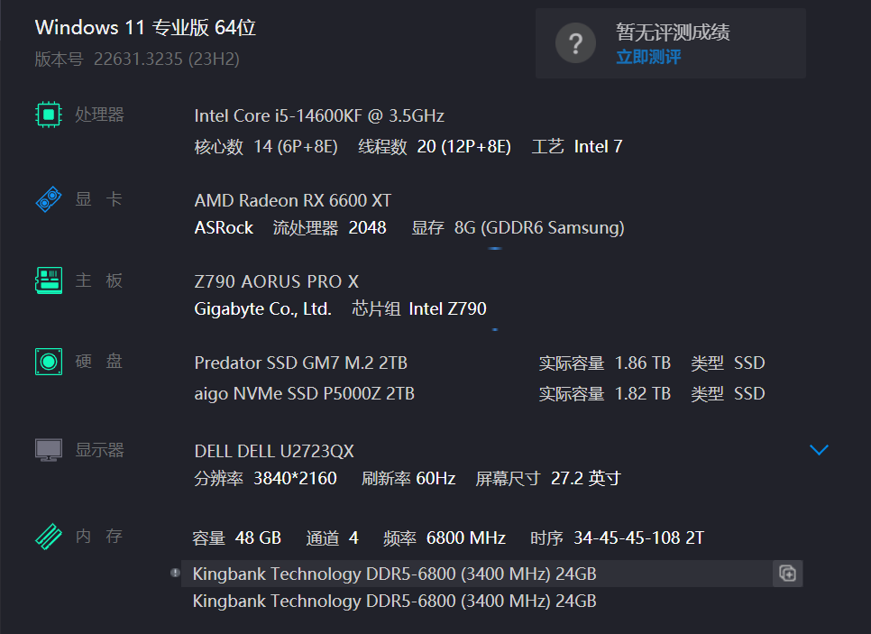 CPU我这里使用的是一颗i5-14600KF,CPU体质技嘉主板CP分95,也就是说CPU体质还算可以,这套主板CPU组合用来测试DDR5内存超频不存在硬件平台上的短板。