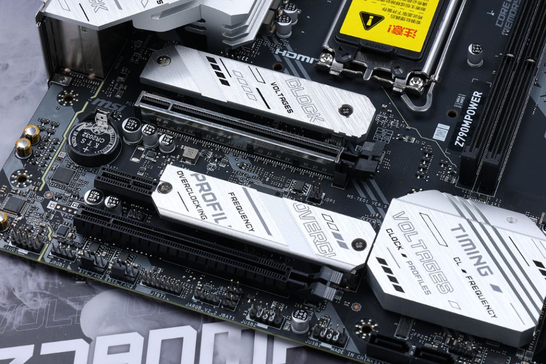 主板配备3个PCIe插槽。近CPU槽直连CPU,最高支持PCIe 5.0 x16的传输速率,并有金属装甲加固,中间PCIe x1规格的插槽则支持PCIe 3.0x1的传输速率,最下方PCIe x16规格插槽则最高支持PCIe 4.0 x4的传输速率;