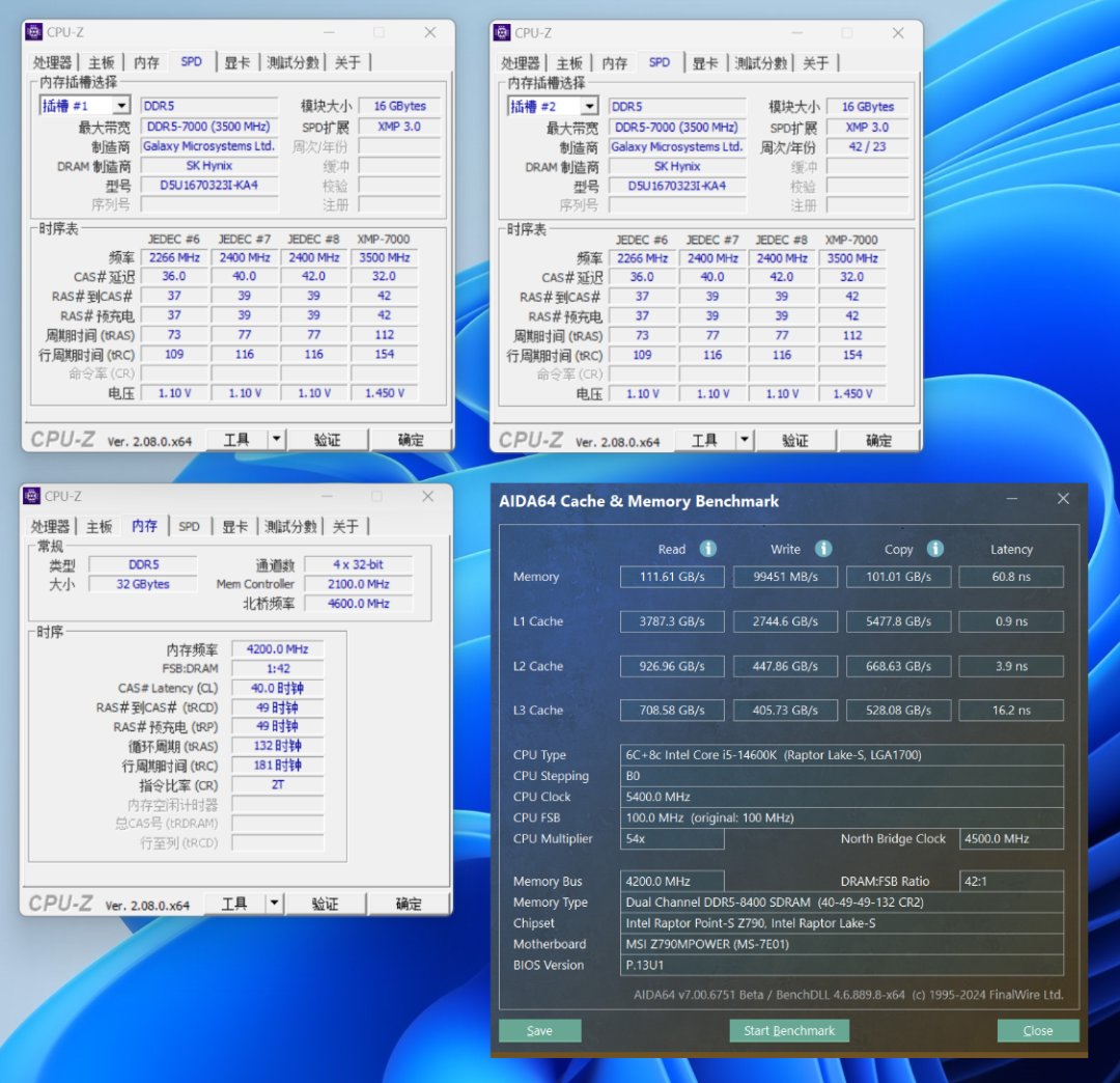 将内存OC至8400MHz C40,内存读取速度为111.61GB/s,写入速度为99451 MB/s,复制速度为101.01 GB/s,延时为60.8 ns;