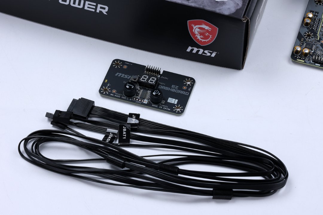 集成电源、重启、清除 CMOS 按钮和 LED 调试指示灯的微星 EZ Dashboard 子板,方便超频玩家进行测试,必须给个好评。