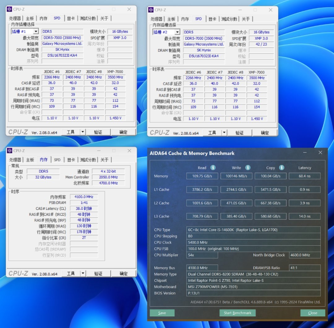 将内存OC至8200MHz C38,内存读取速度为109.75GB/s,写入速度为100146 MB/s,复制速度为100.04 GB/s,延时为60.4 ns;