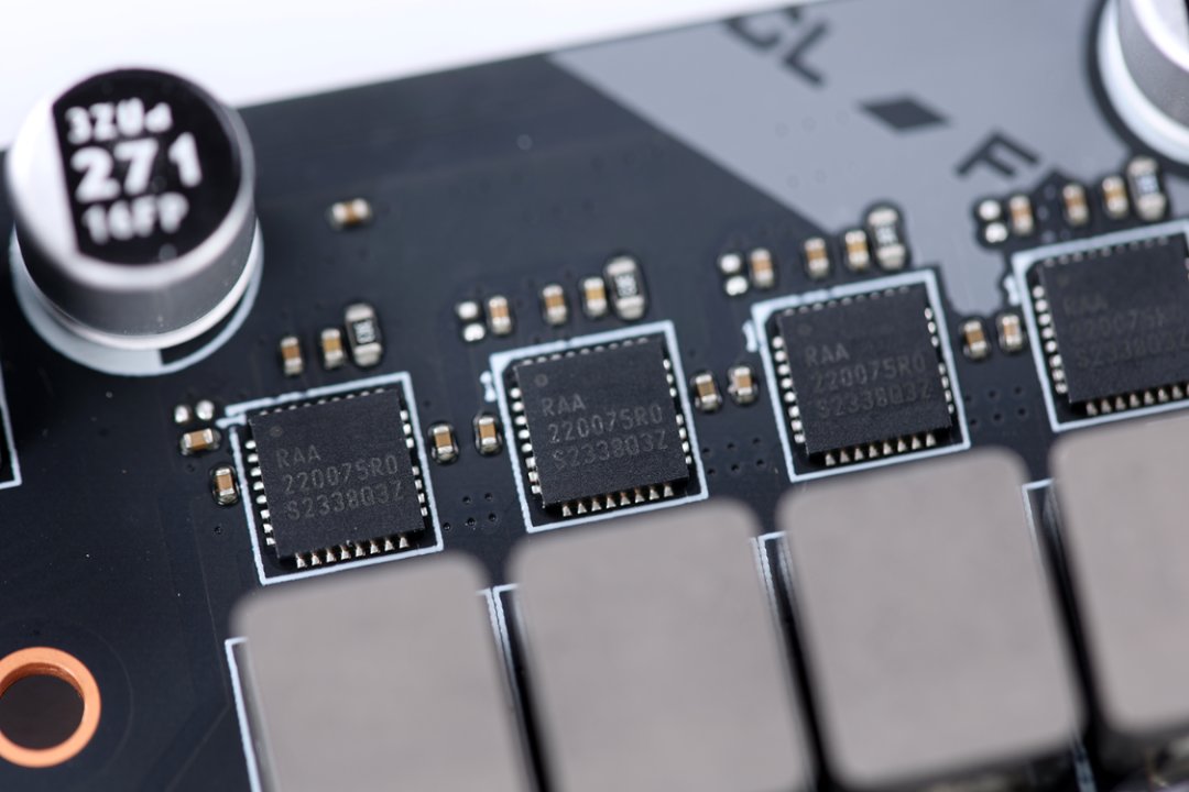 主板的PWM主控芯片为瑞萨RAA229132,并且每一相供电模块都搭配了一颗瑞萨RAA220075R0 DrMOS(75A)供电芯片,在左侧供电模组的下方还有一颗来自美国芯源MPS的M2940A供电芯片;