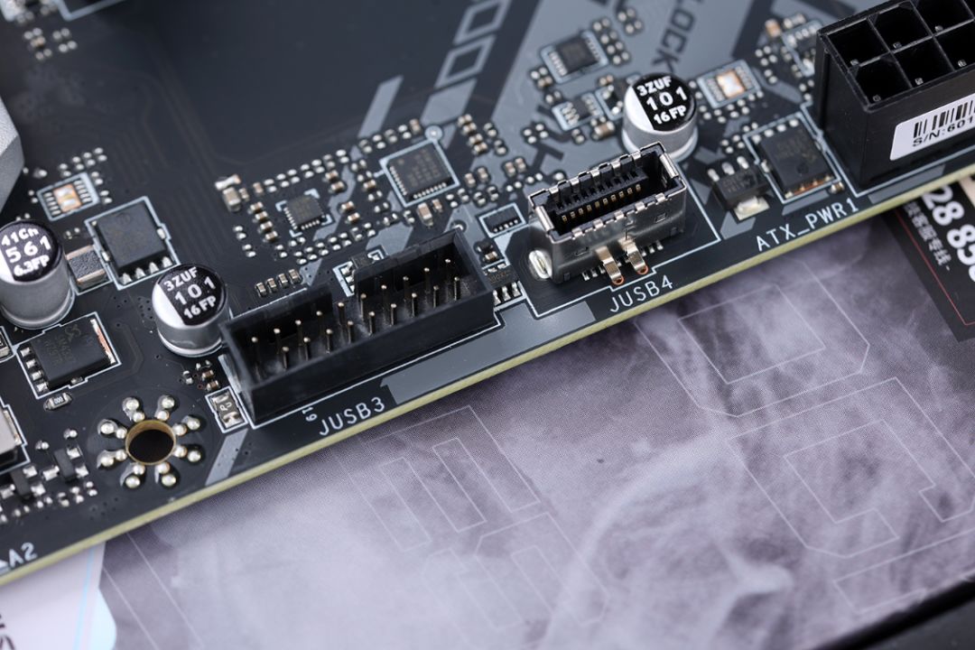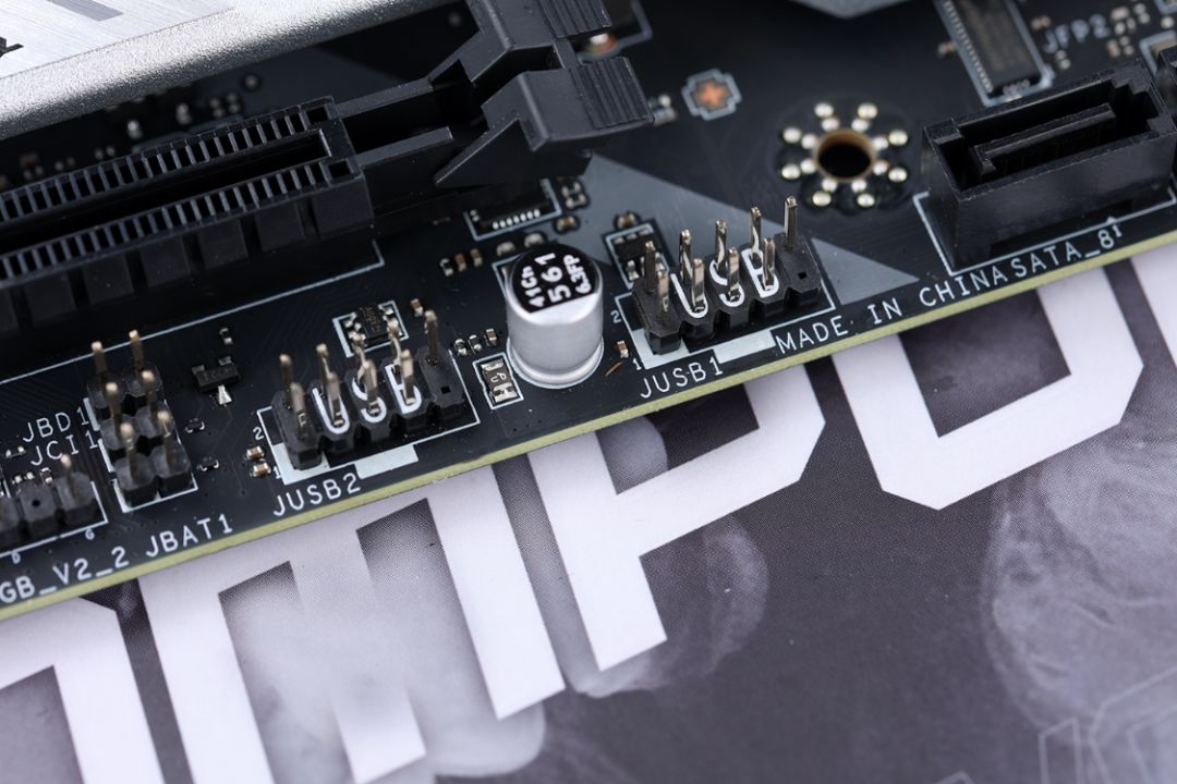 前置I/O拓展接口方面,在24Pin供电接口旁边提供了1个USB 3.0插针接口、1个Type-C插槽,2个USB 2.0插针接口则位于主板底部。所有接口最多可接驳出4个USB 2.0、2个USB 3.2 Gen1、1个USB 3.2 Gen2 Type-C数据接口,可以满足绝大多数机箱的前置I/O拓展需求。
