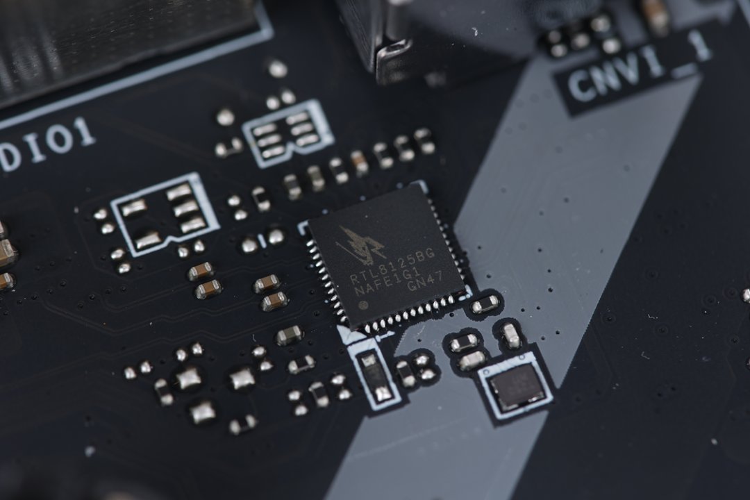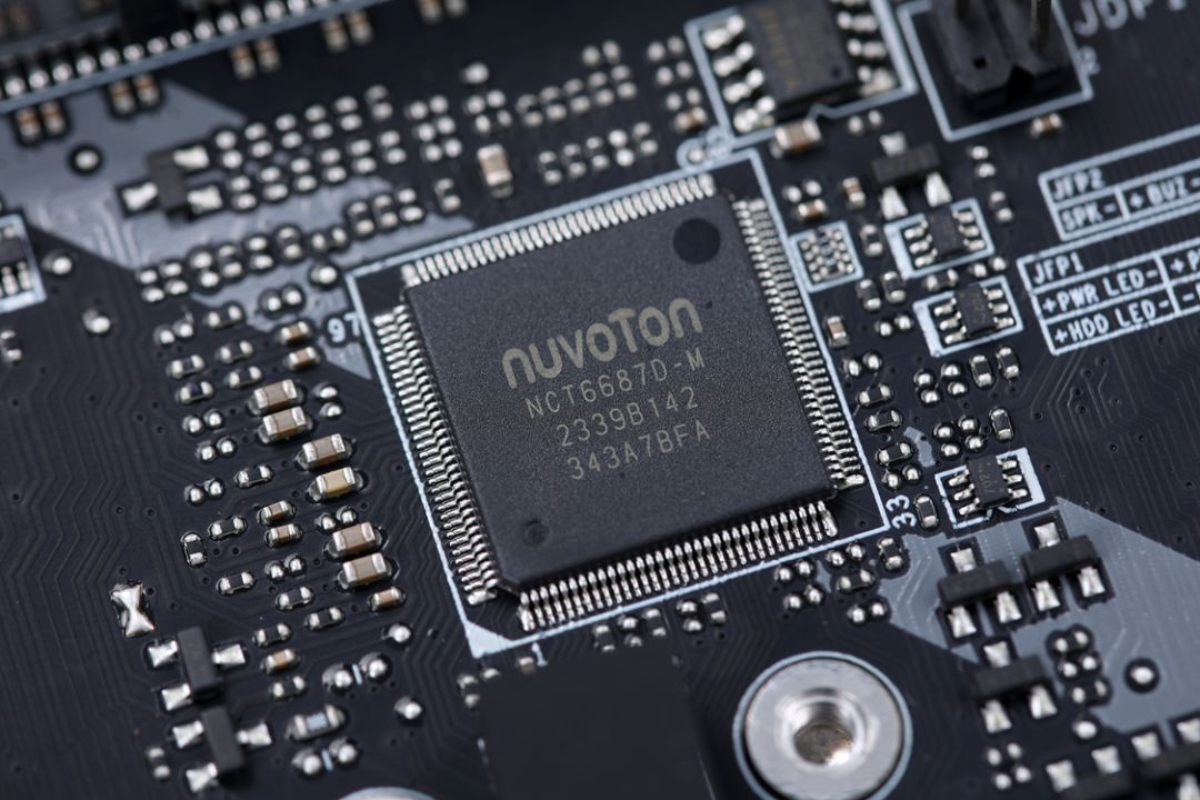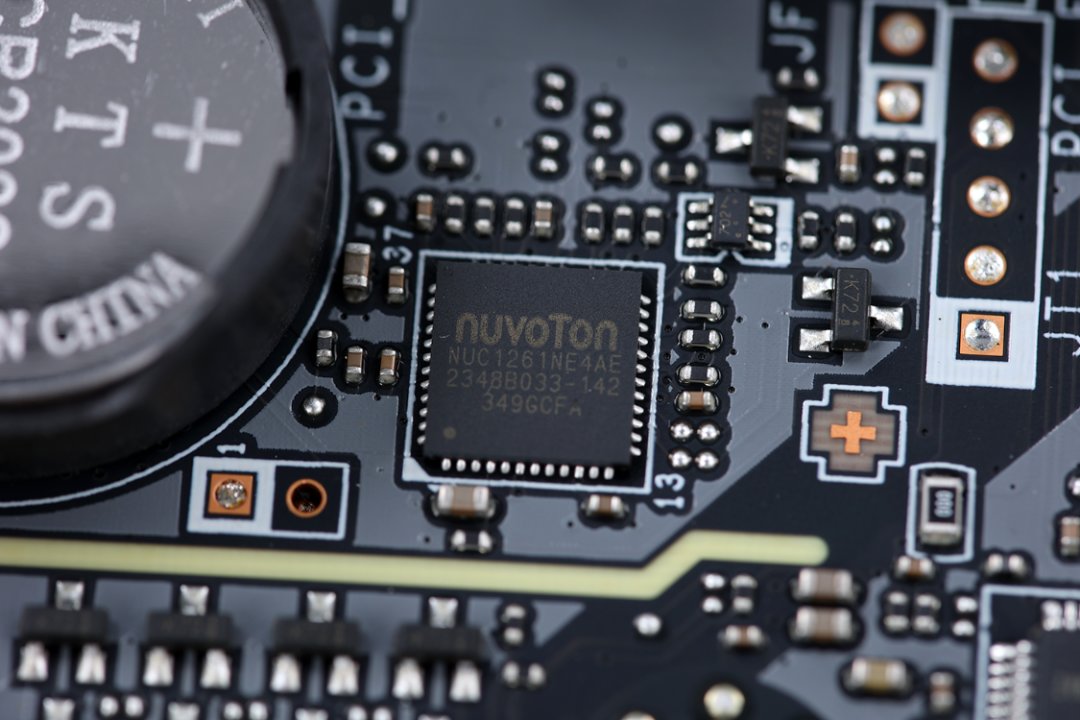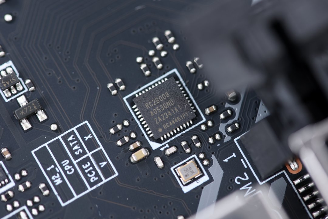 2.5G LAN有线网络采用瑞昱的RTL8125BG有线网卡,声卡芯片位于主板左下角,芯片型号为瑞昱ALC897,声卡旁边则是型号为新唐(Nuvoton) NUC1261NE4AE的灯效控制芯片。负责监控主板状态信息的Nuvoton NCT6687D-M芯片则位于主板PCIe X1插槽的右侧。而在主板近CPU侧PCIe插槽的上方,还提供了一颗用于控制CPU外频的独立时钟发生器,芯片型号为RG26008,这也意味着12代非K处理器也可以在这块主板上调整外频;