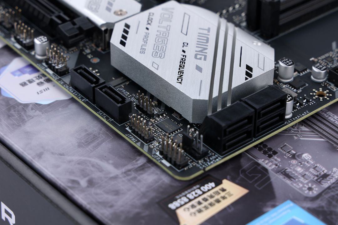 存储方面,主板配备2个M.2固态硬盘位,均支持PCIe 4.0 x4的传输速率,并且都配备了螺丝固定的单面散热马甲,厚实的散热马甲可以应对目前市面上绝大多数高性能硬盘的散热需求。其中,近CPU侧的硬盘位还预装了支持硬盘快装的固定卡扣;