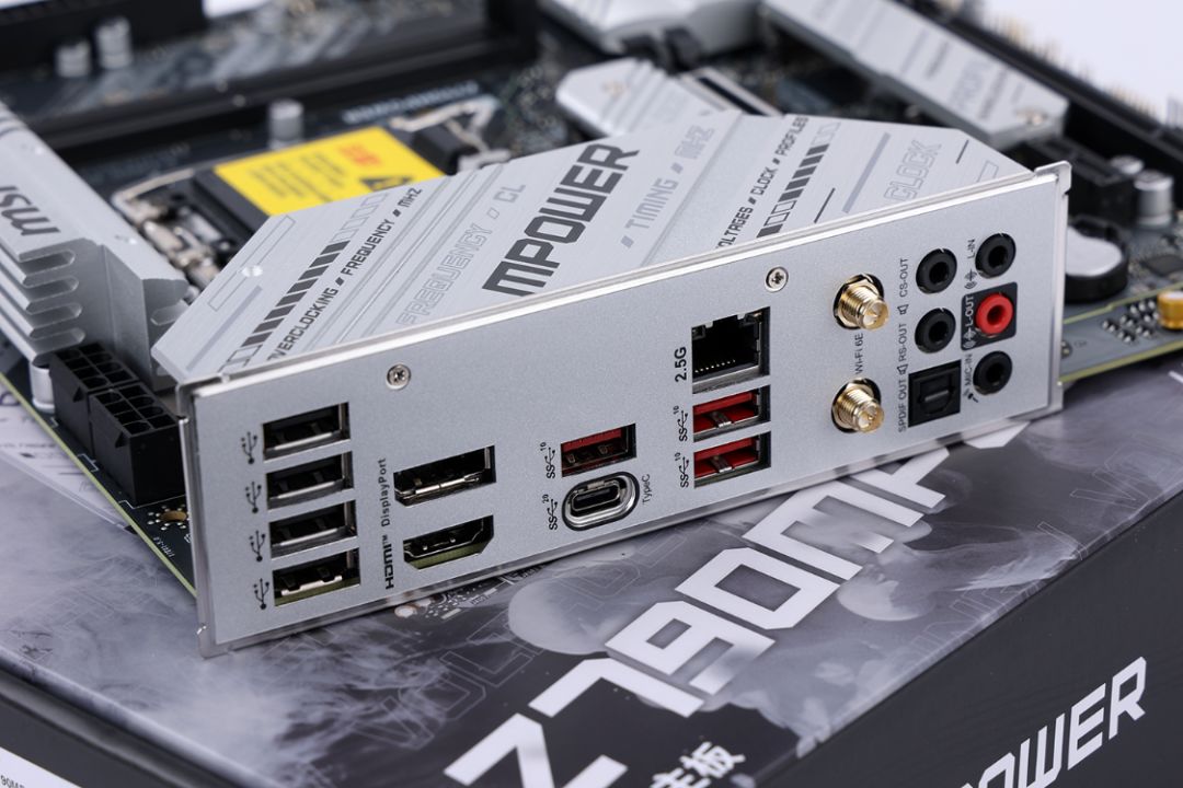 一体式后置I/O面板,接口从上至下依次为4个USB 2.0数据接口、DP1.4与HDMI2.1视频接口、1个TYPE-C USB3.2 Gen2X220Gbps、3个USB3.2 Gen2 10Gbps(红色接口)、一个2.5GLAN有线网络接口 、1对支持WIFI 6E和蓝牙5.3传输协议的双天线接口以及一组音频输入输出口。