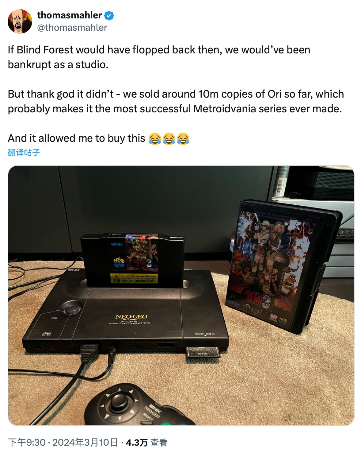 除了分享《奥日》系列的成功,Thomas Mahler还展示了他的复古游戏收藏,其中包括备受玩家喜爱的经典游戏《合金弹头 3》的NEOGEO版本。这些复古游戏不仅代表了他个人的游戏情怀,也反映了Moon Studios在游戏开发方面的广泛兴趣和深厚底蕴。