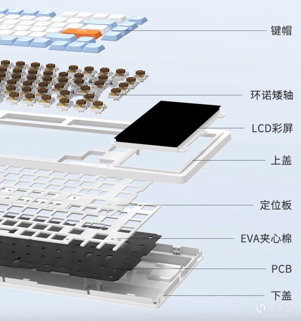 黑爵AKP815机械键盘在结构上使用了Gasket结构,有了定位板也能有效防止键轴晃动,EVA夹心棉层可以降低缓冲键盘敲击带来的振动。对于喜欢日常打字,偏向码字的用户来说这个敲击的手感十分的舒适,类似打字机的声音反而更有感觉。