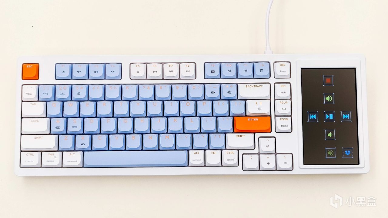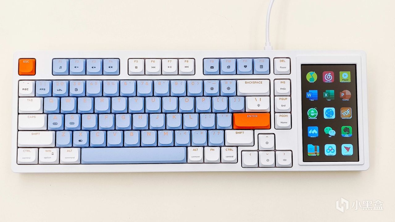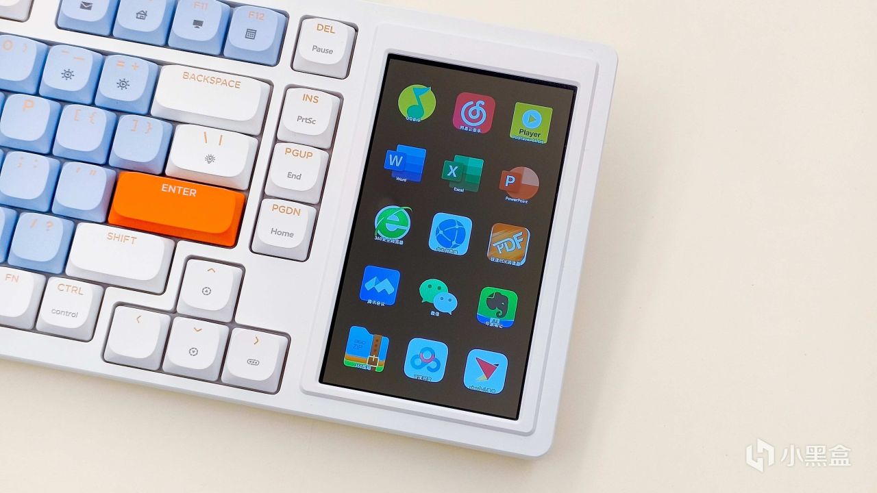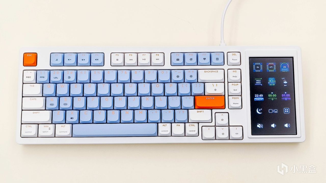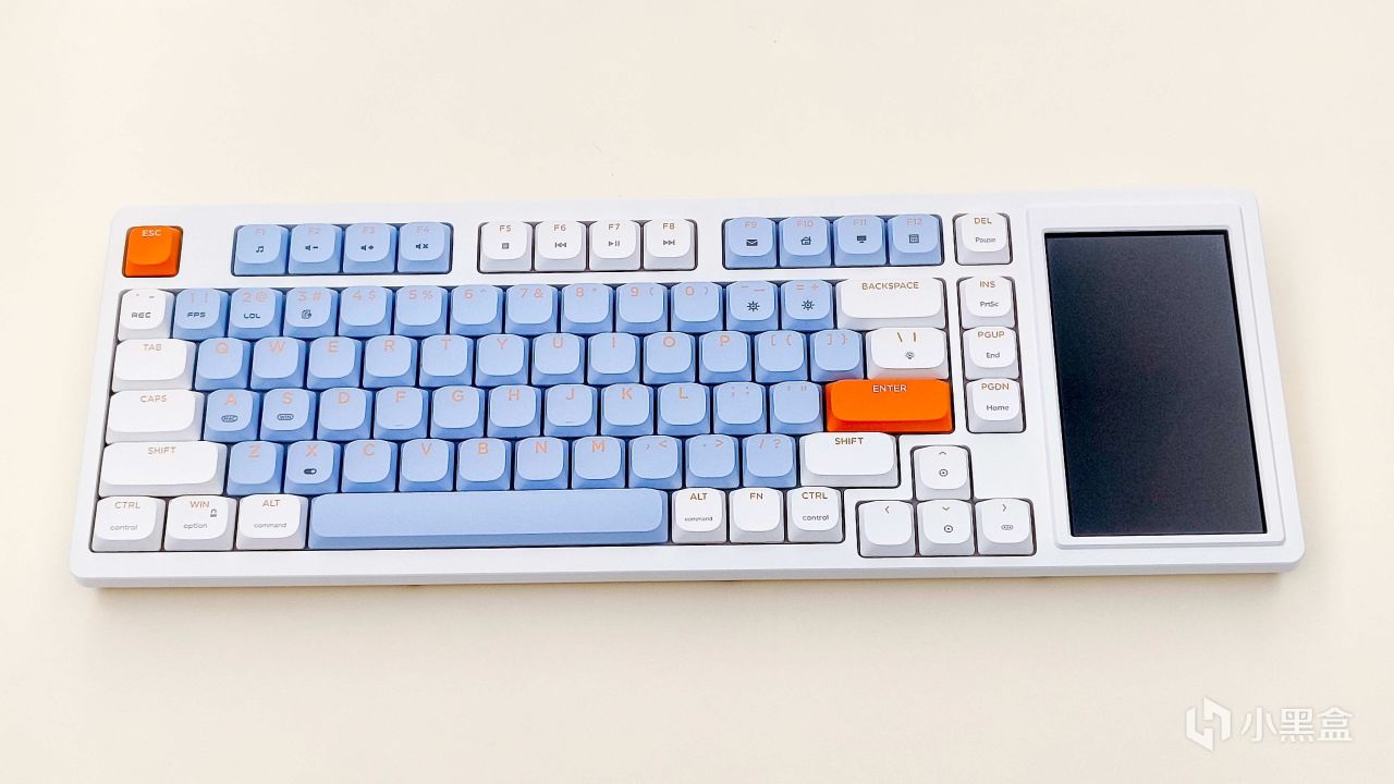 刚拿出来发现这个黑爵AKP815机械键盘的配色还是蛮好看的,仔细看就会发现小键盘区域消失了,取而代之的就是多了一块4.95英寸的LCD触控彩屏。