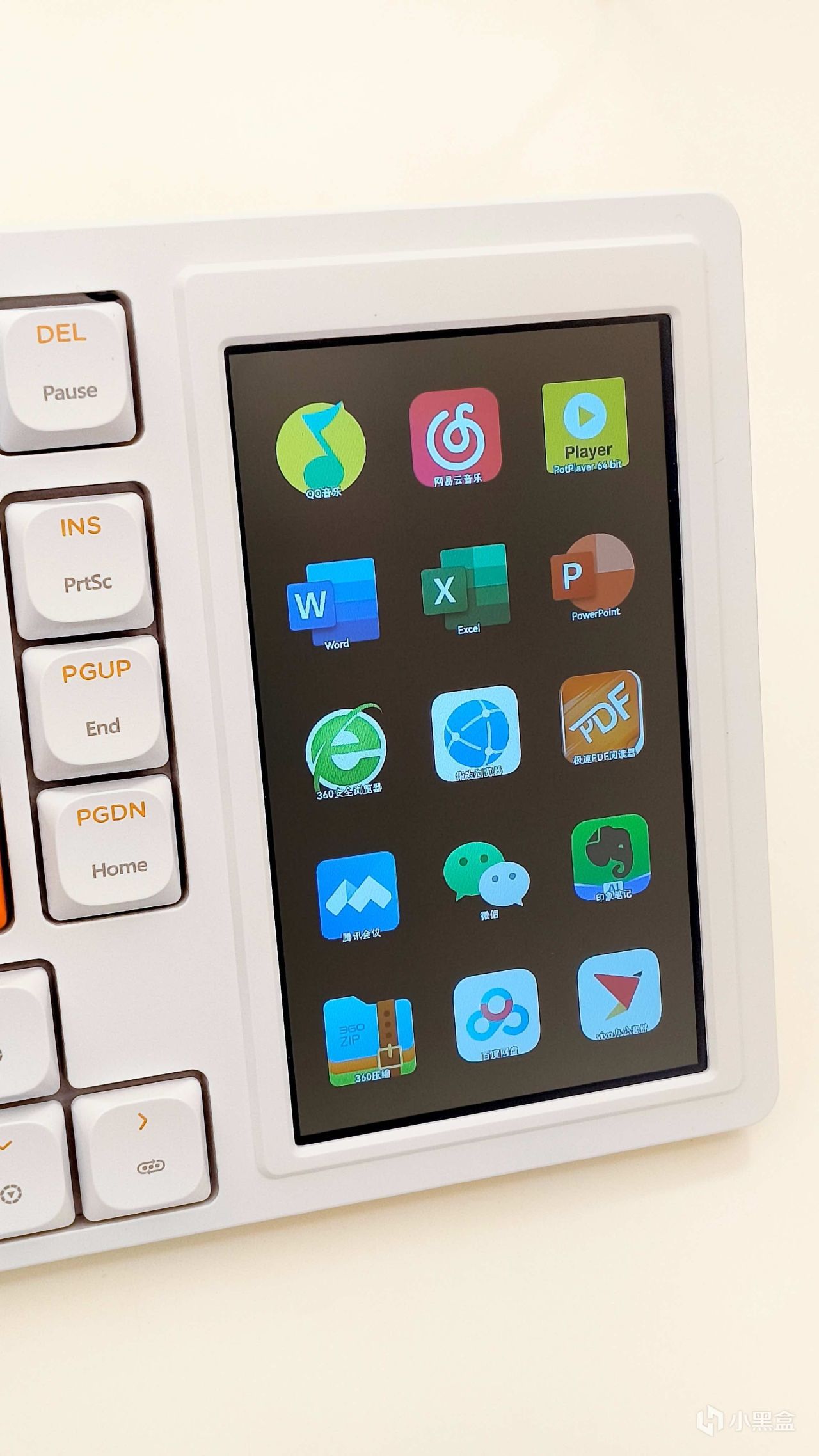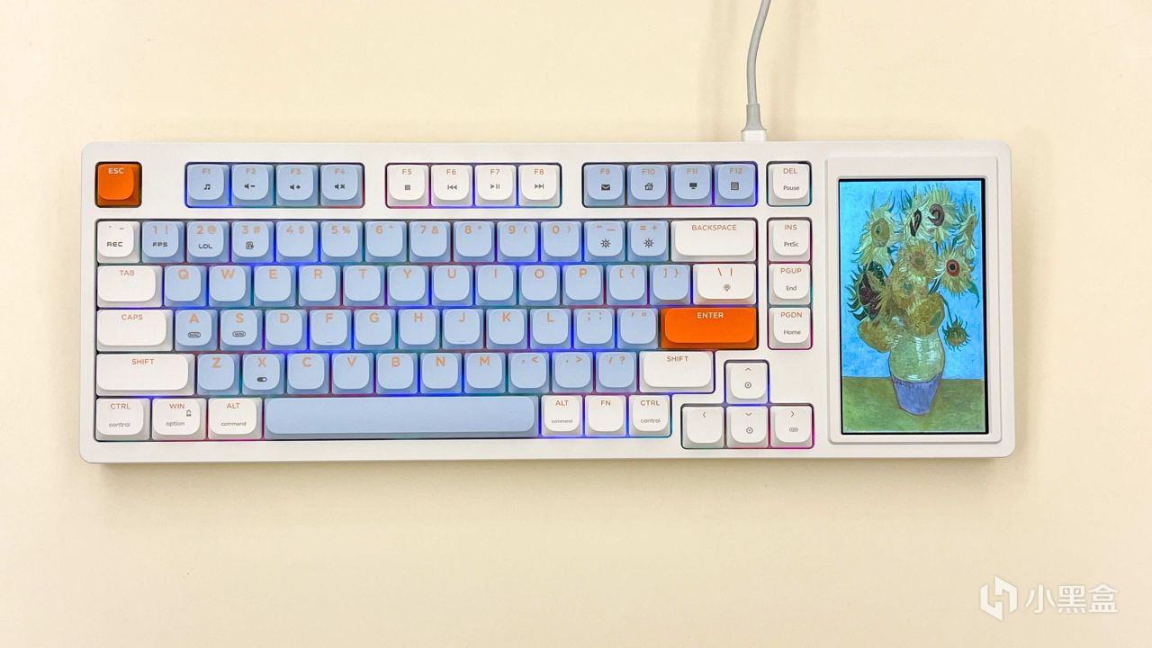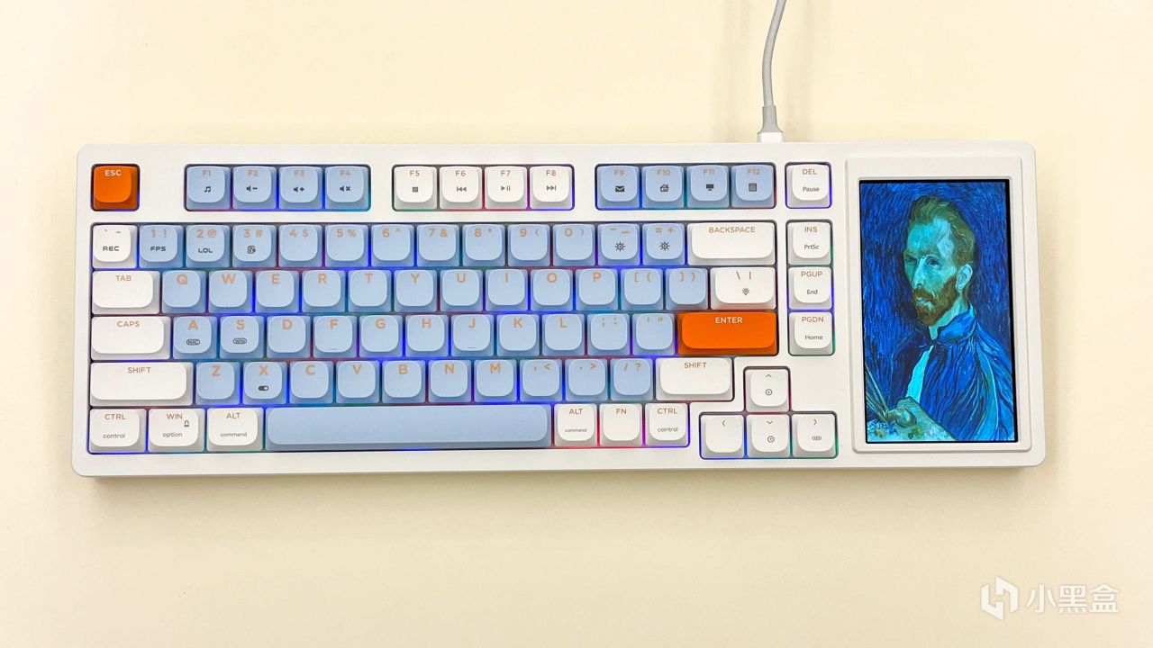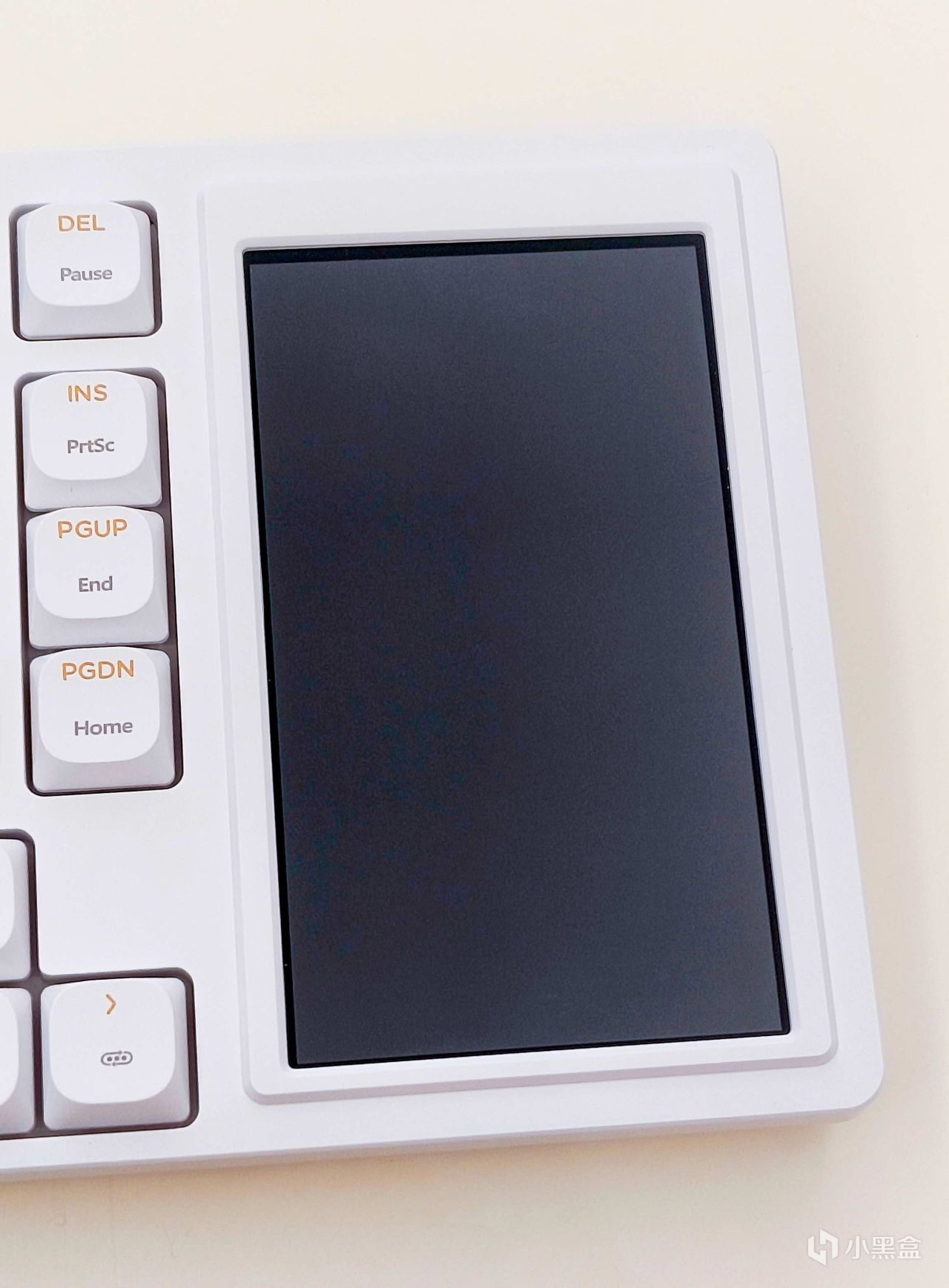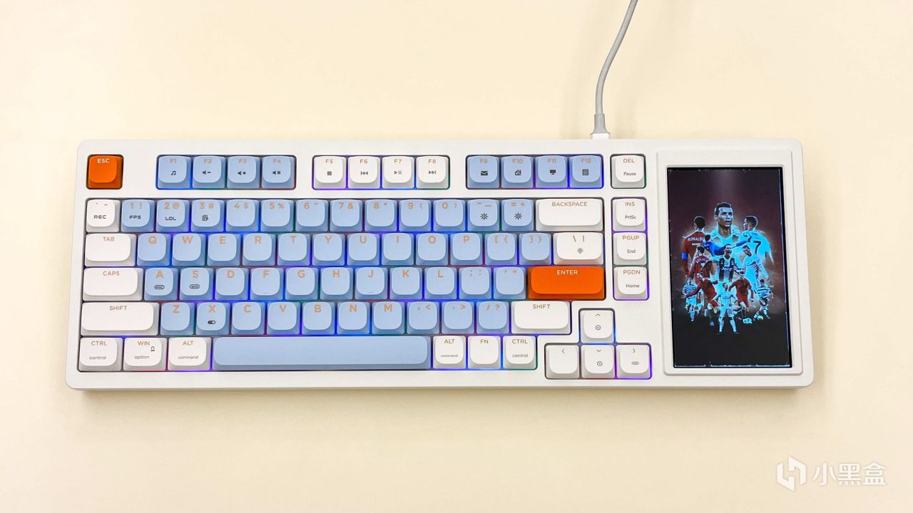 刚拿出来发现这个黑爵AKP815机械键盘的配色还是蛮好看的,仔细看就会发现小键盘区域消失了,取而代之的就是多了一块4.95英寸的LCD触控彩屏。