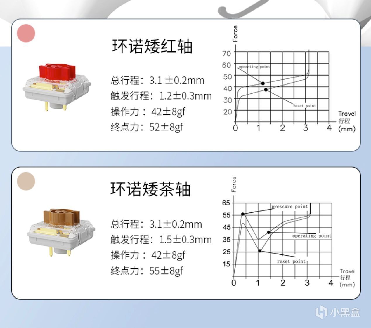 黑爵AKP815机械键盘的轴体是有红轴和茶轴两个版本,均为环诺矮轴。其中红轴终点力行程是52±8gf,茶轴终点力行程是55±8gf。