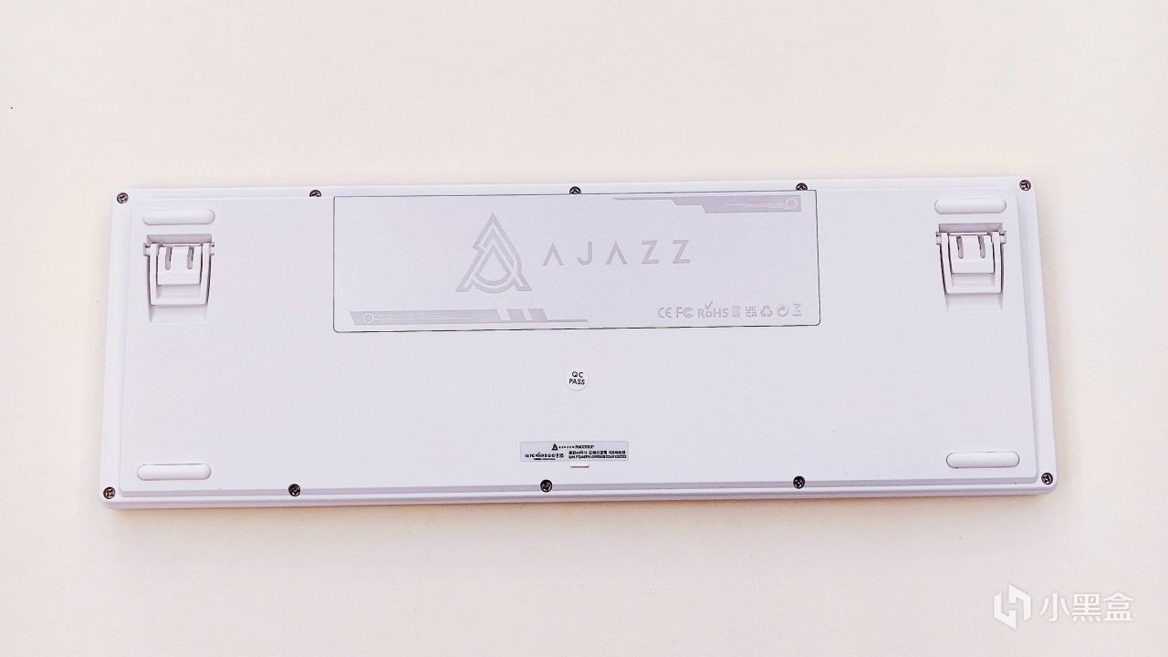 黑爵AKP815机械键盘的背面是ABS底壳,其中靠近Type-C的背面上方区域还做了一整块金属拉丝铝板的基底来展示logo,摸上去既有质感又显得很有档次的。