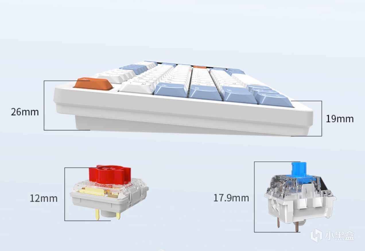 黑爵AKP815机械键盘的键帽也是ABS注塑,支持全键无冲突。轴体相对常规的机械轴体能看出来明显要薄很多,仅有12mm,这也意味着敲击键轴的手感会很舒服。得益于轴体较为轻薄,黑爵AKP815机械键盘整体的厚度控制也很到位,最薄处仅有19mm,最厚处也才26mm,是目前机械键盘厚度里很少见的纤薄机身了。