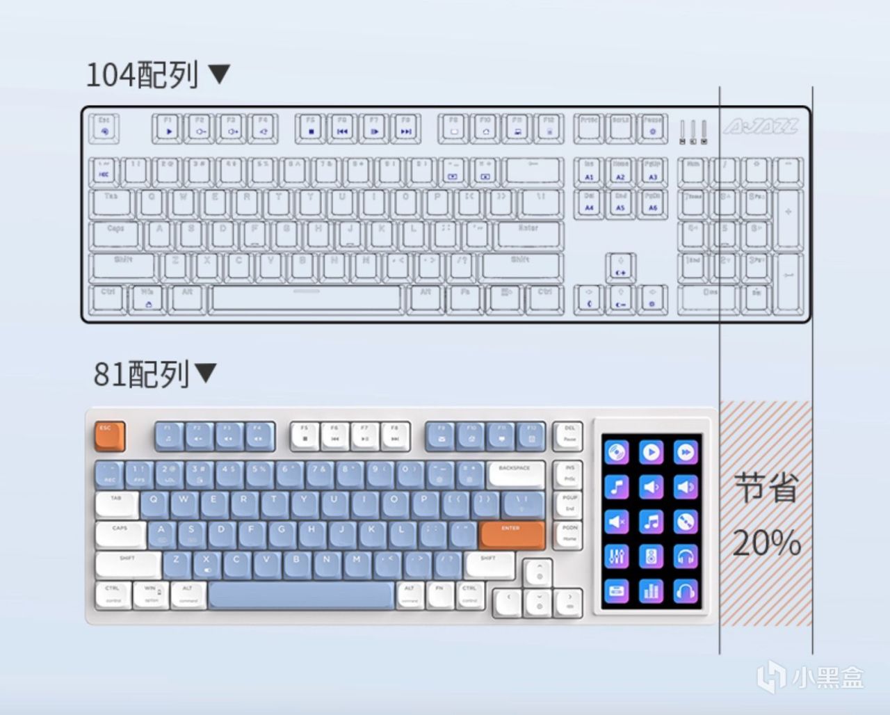 黑爵AKP815机械键盘其实是81键的配列布局,相对于104键盘的配列布局明显是要小了一圈的,毕竟是将数字键盘区域换成了屏幕字体体积就要小巧许多,相比较于104配列的机械键盘来说,黑爵AKP815机械键盘反而还缩减了20%的面积。
