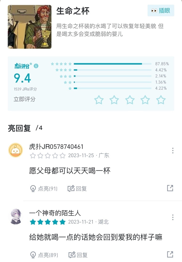 喝了用生命之杯装的水之后可以恢复年轻美貌,但喝太多会变成脆弱的婴儿