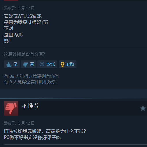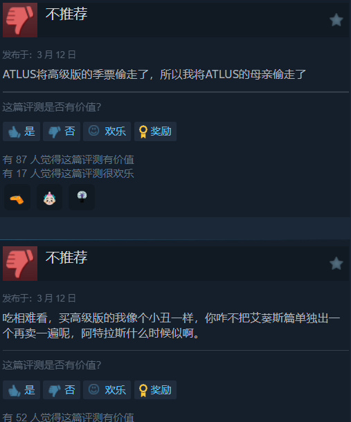 2,《P3R》DLC登陆Steam,售价159元,但好评率仅29%,多半差评!玩家批评Altus将DLC独立出售的做法不合道义。