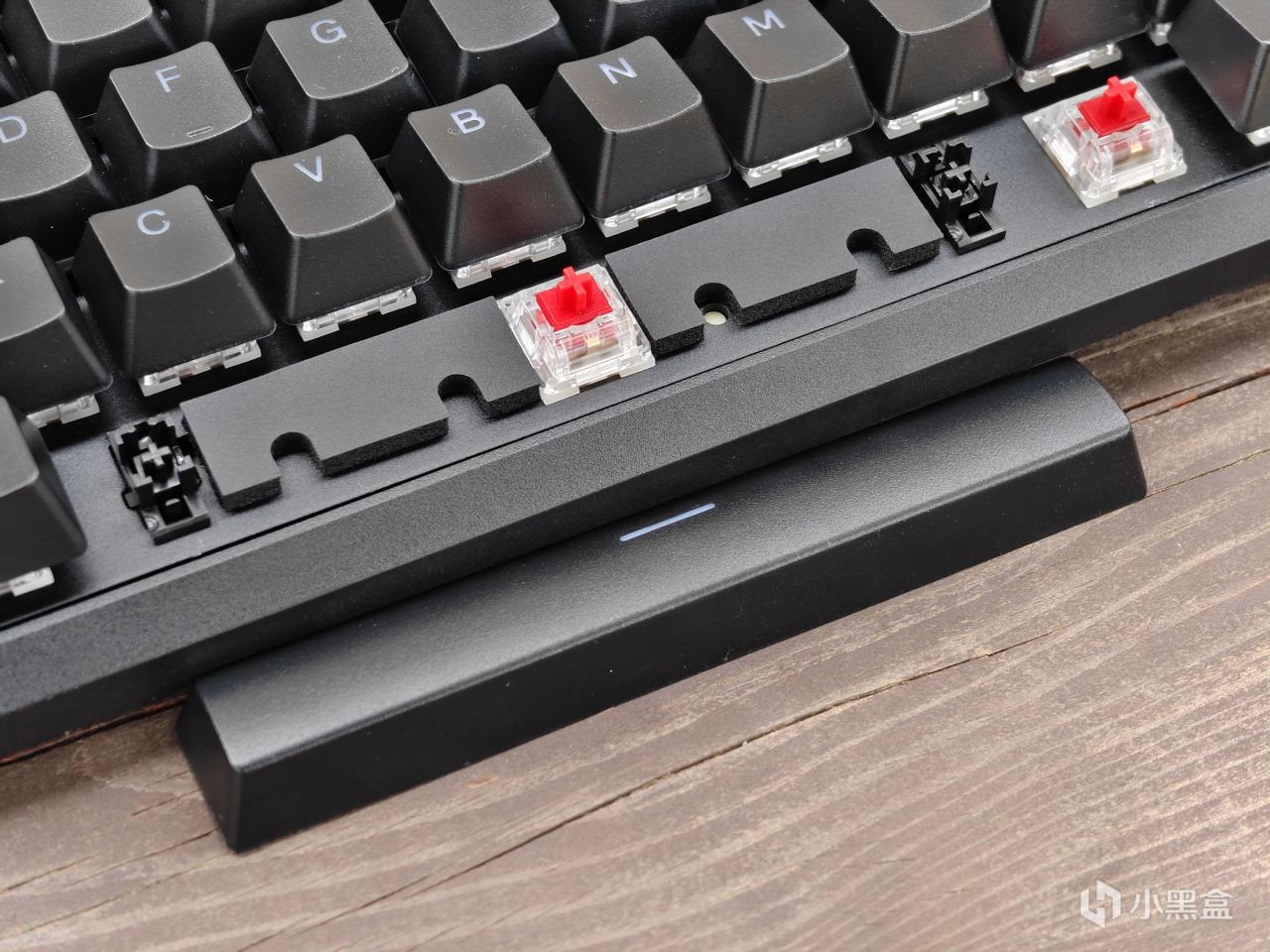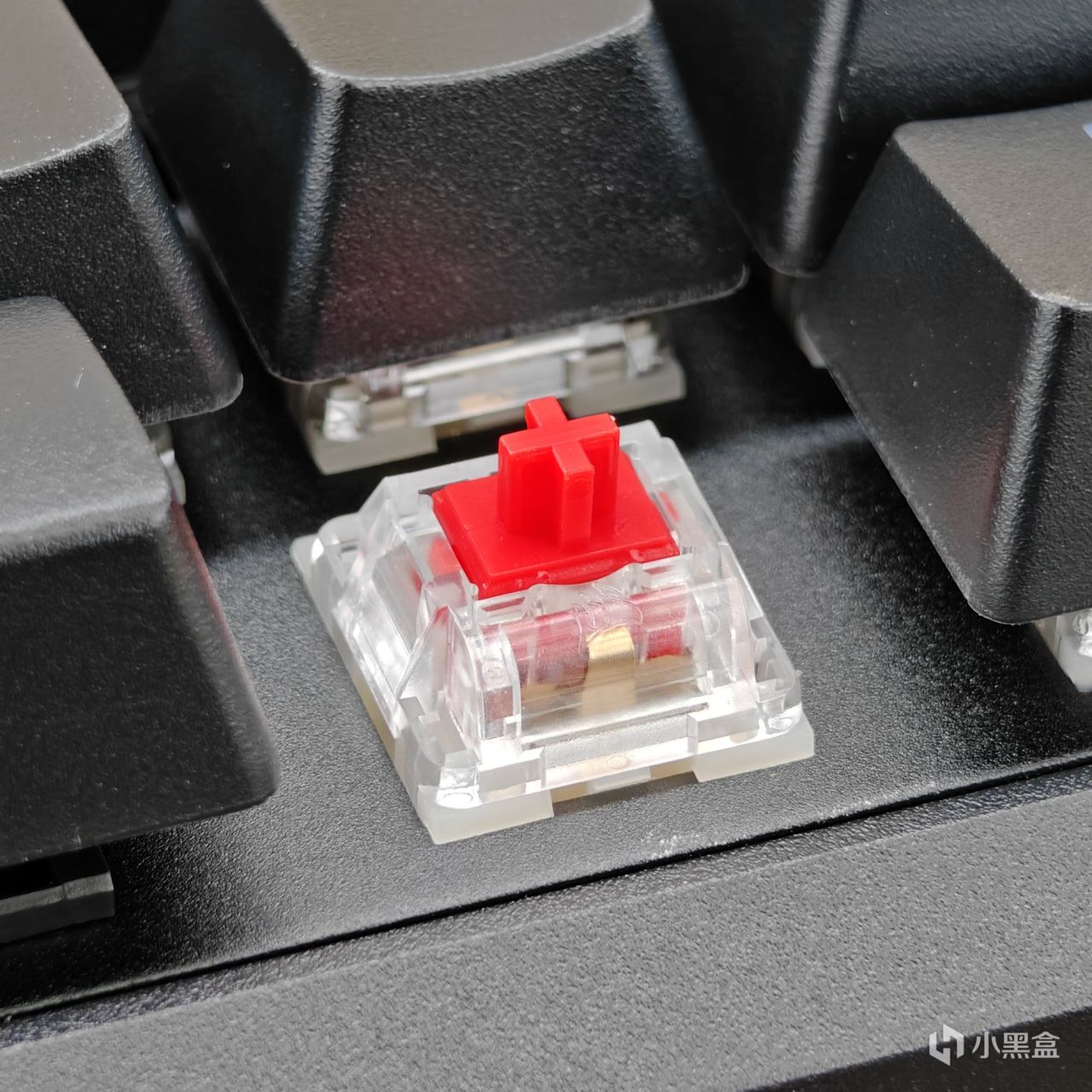 轴体方面,K70 CORE使用自己家的线性红轴(不完全静音的红轴),透明轴盖+红色十字轴心方案,在兼容性和透光性效果不错。