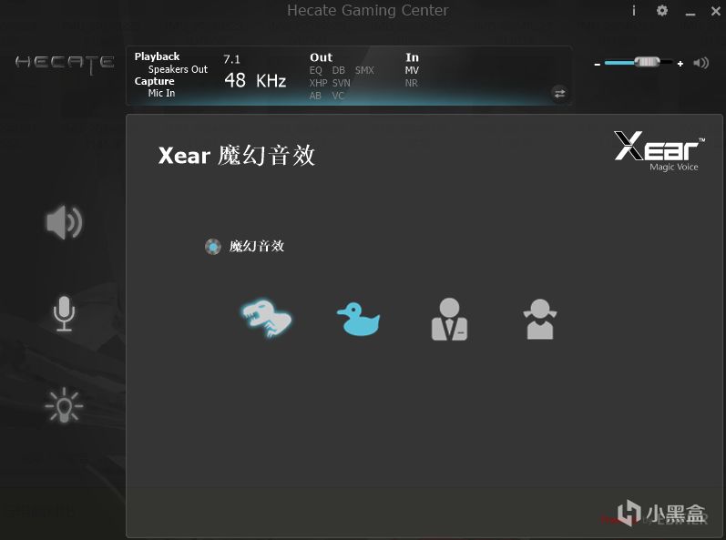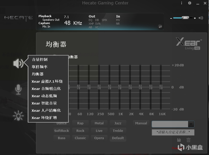 G1500bar的可玩性也是非常强的,通过HECATE自家的驱动软件,我们就可以自由地去设置音响。通过这个驱动软件,不仅可以自定义EQ、开启虚拟7.1环绕音效等音效设置之外,还能设置RGB的灯光跟开启“魔幻音效”,开启这个音效之后就能在4种音效中变幻,非常好玩。