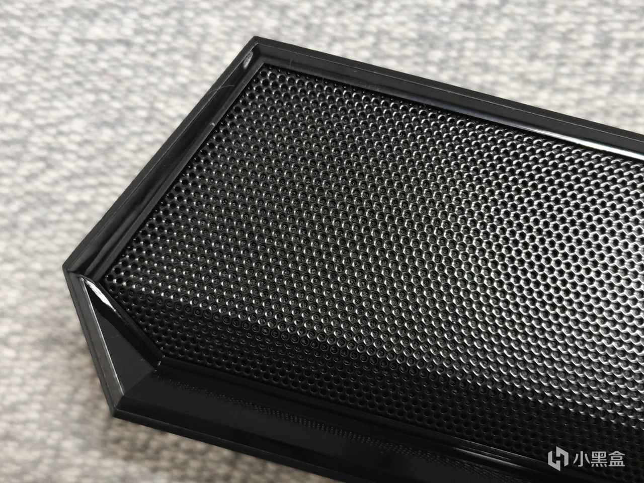 正面的出音位置是铁网设计,不怕磕碰,经久耐用。正面铁网是仰角设计,能够更好地增强声场。除此之外,在正面还有一排功能按键及下方的RGB灯条。别看按键只有4颗,但是常用功能都可以靠这几个按键自由切换,底下的RGB灯条还支持音乐律动,这也是骑猫非常喜欢的模式,非常炫酷。