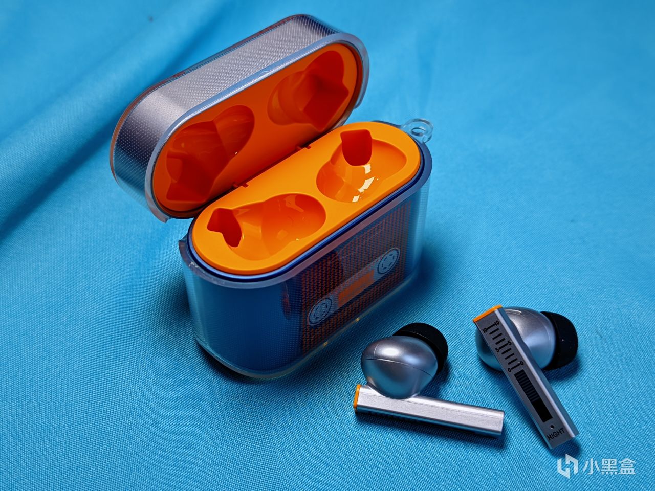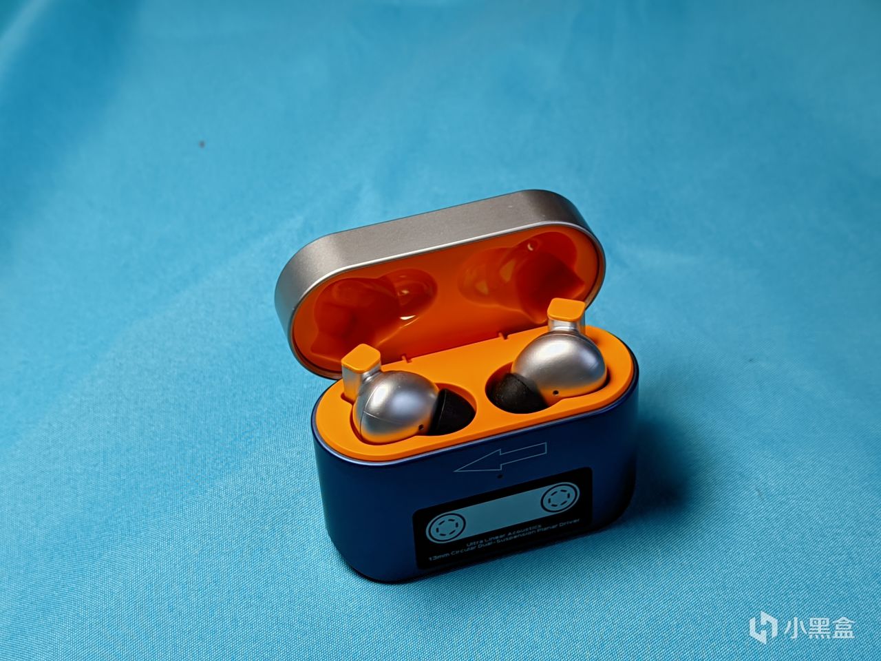 耳機倉內部採用了亮橙色的設計風格,配合上銀色爲主色調的耳機還算好看,不過不知道是不是試製品的原因,我手上的耳機其合模線做的有點明顯,不過也有可能是要在耳機中塞入一個13mm的全頻平板單元的原因,同時其本身還有着由創始人操刀設計並主導研發的專利換能器單元,配合着多枚N55釹磁體組成的磁路陣列和環形磁路振膜設計以及雙重懸掛系統,使得其失真度得到了很明顯的降低。