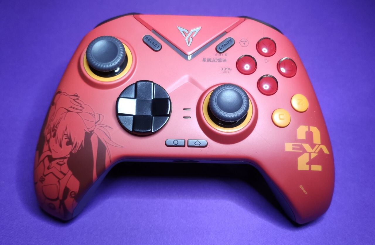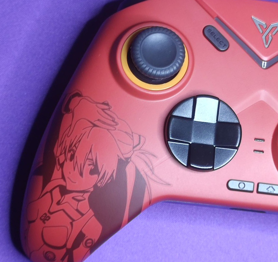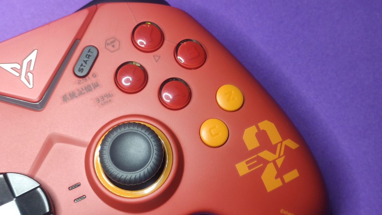 这款明日香联名手柄的外观设计真的很戳我,正面整体以香香的代表色红色为主、黄色为辅助,左手柄位则是香香的剪影,右手柄位则是香香的EVA2号机的标志,下面还有一个超小的“@khara”(EVA制作公司),并且按键处还有一些机体的问题提示等。