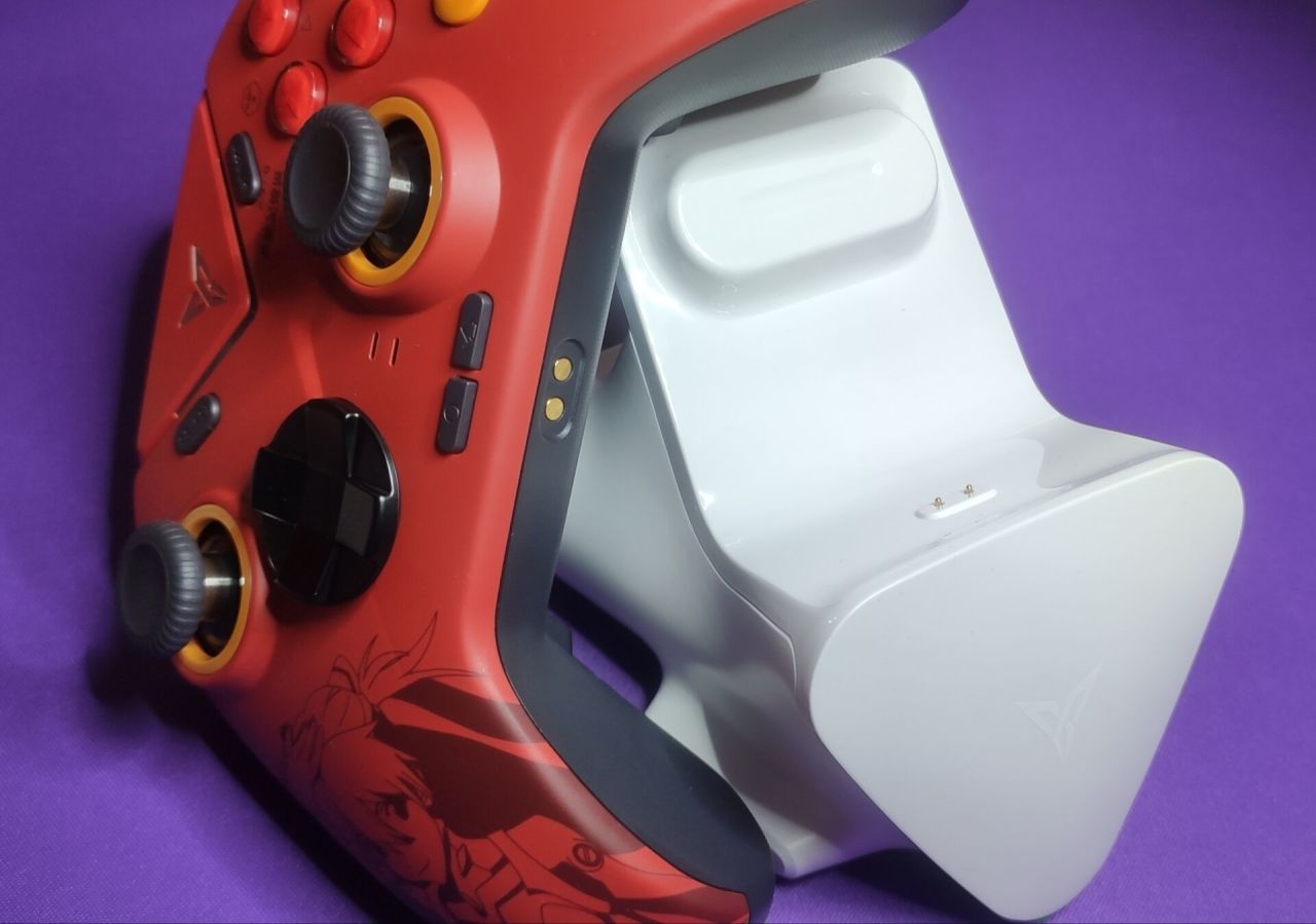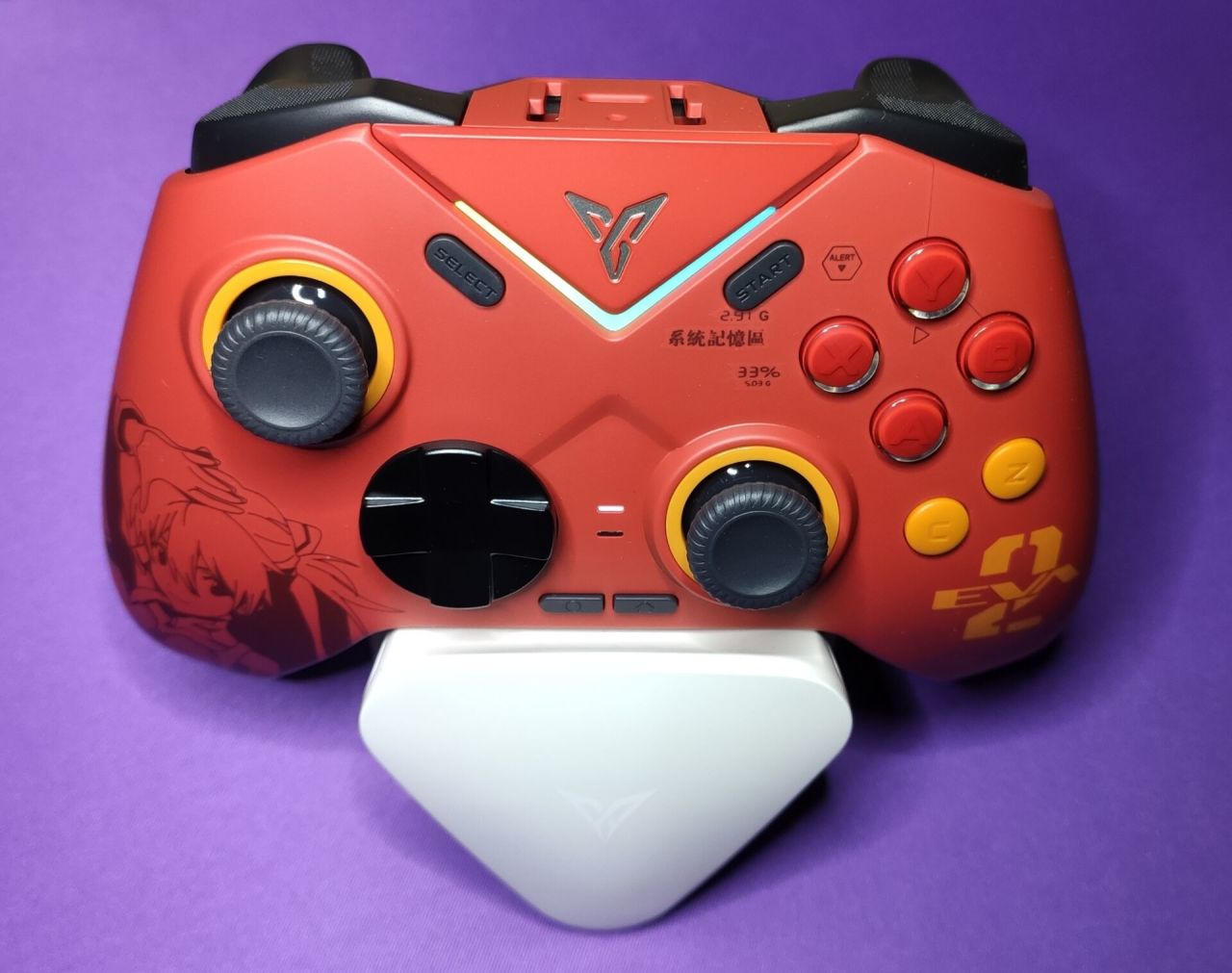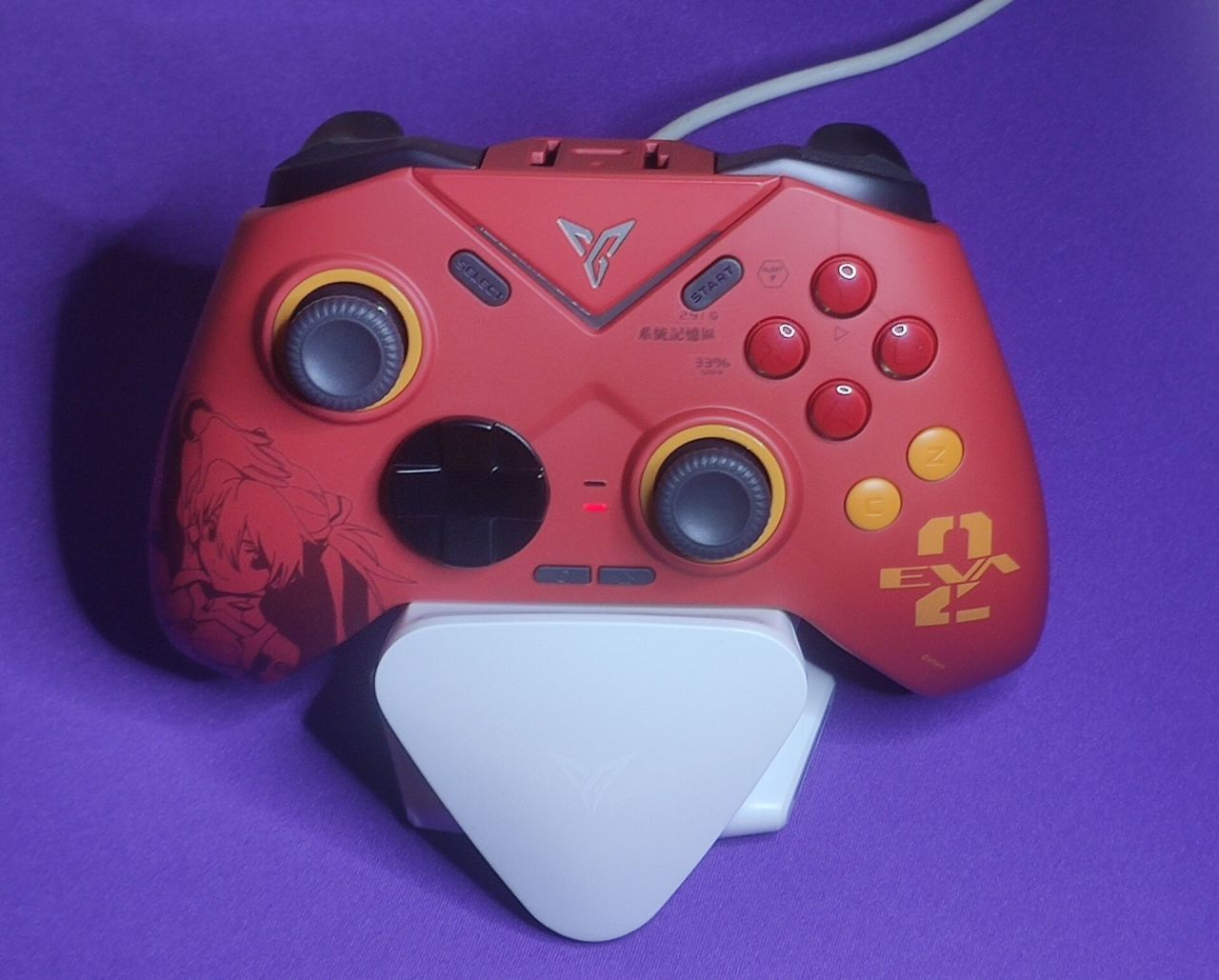 这款明日香联名手柄的外观设计真的很戳我,正面整体以香香的代表色红色为主、黄色为辅助,左手柄位则是香香的剪影,右手柄位则是香香的EVA2号机的标志,下面还有一个超小的“@khara”(EVA制作公司),并且按键处还有一些机体的问题提示等。