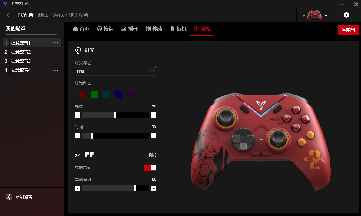 在飞智官网下载“飞智空间站”后还可以设置一些手柄的参数,按键、摇杆、体感、扳机等,常规里还能设置灯光的闪缩方式或者关闭灯光,也可以根据自己的喜好来设置手柄的震动频率。