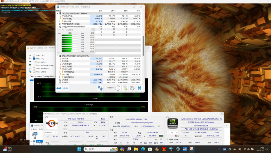显卡在105W左右,频率1.99GHz左右,温度维持在68度左右