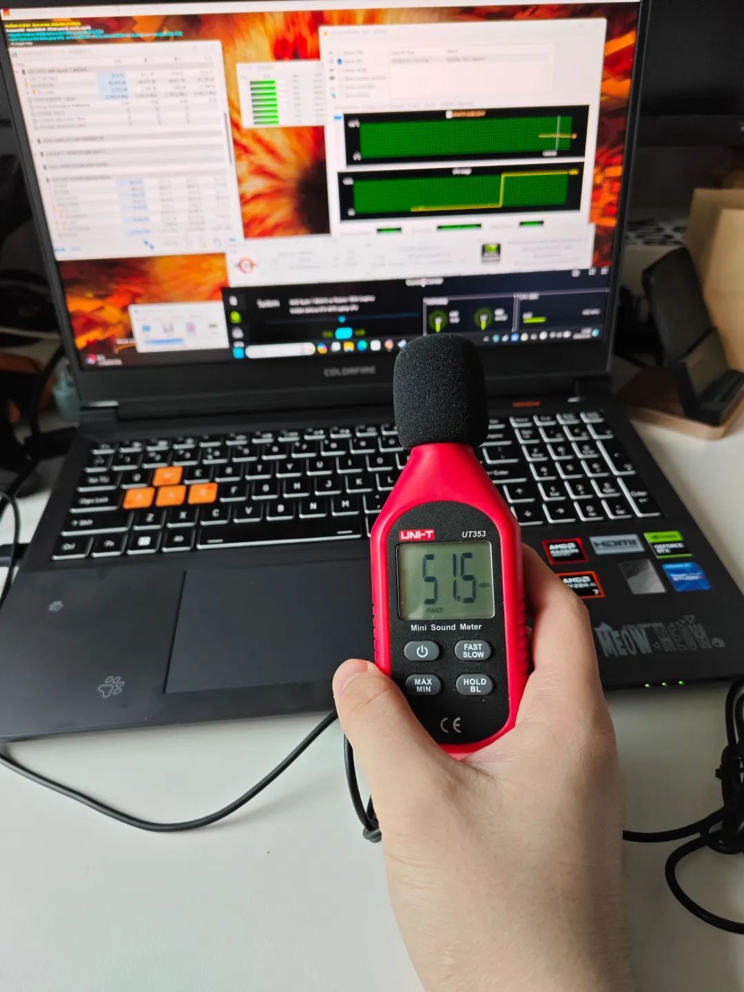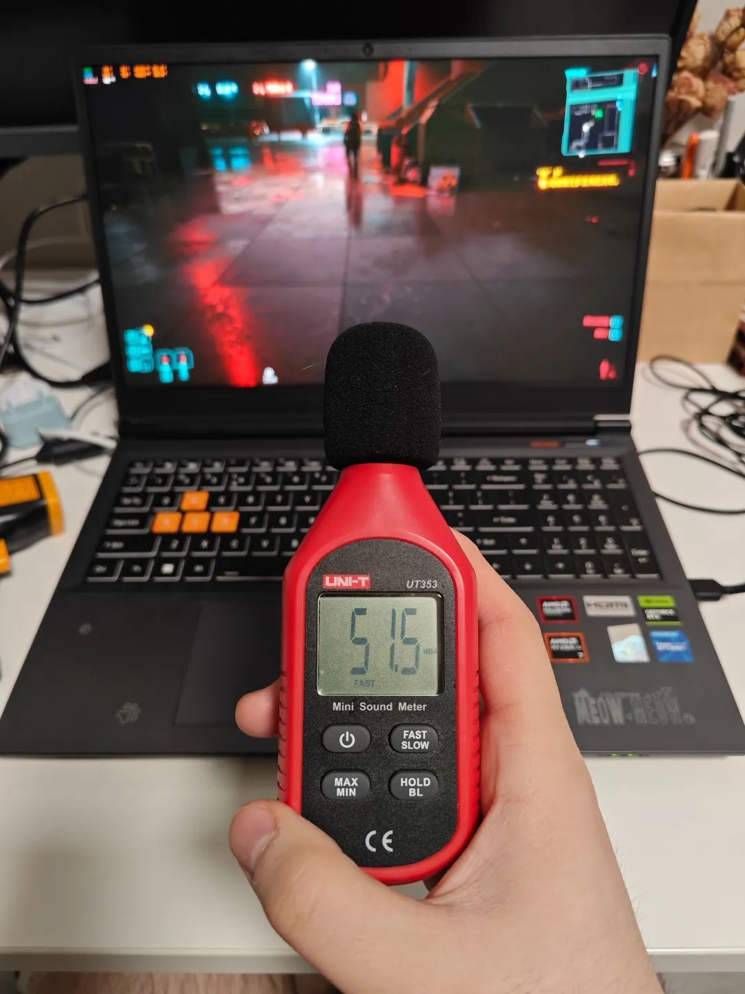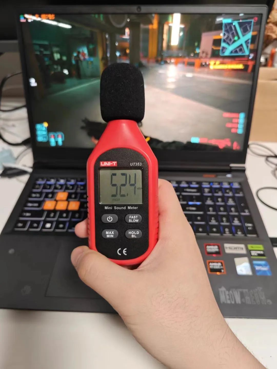 游戏实测噪音52.4-53分贝左右(环境噪音为40分贝)比双烤55.5分贝噪音更低,这个噪音表现还不错,属于游戏本中噪音表现比较好的一档。