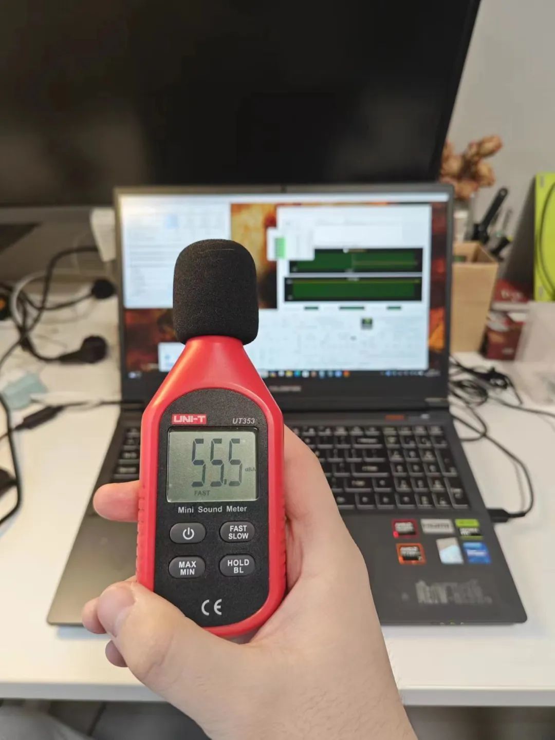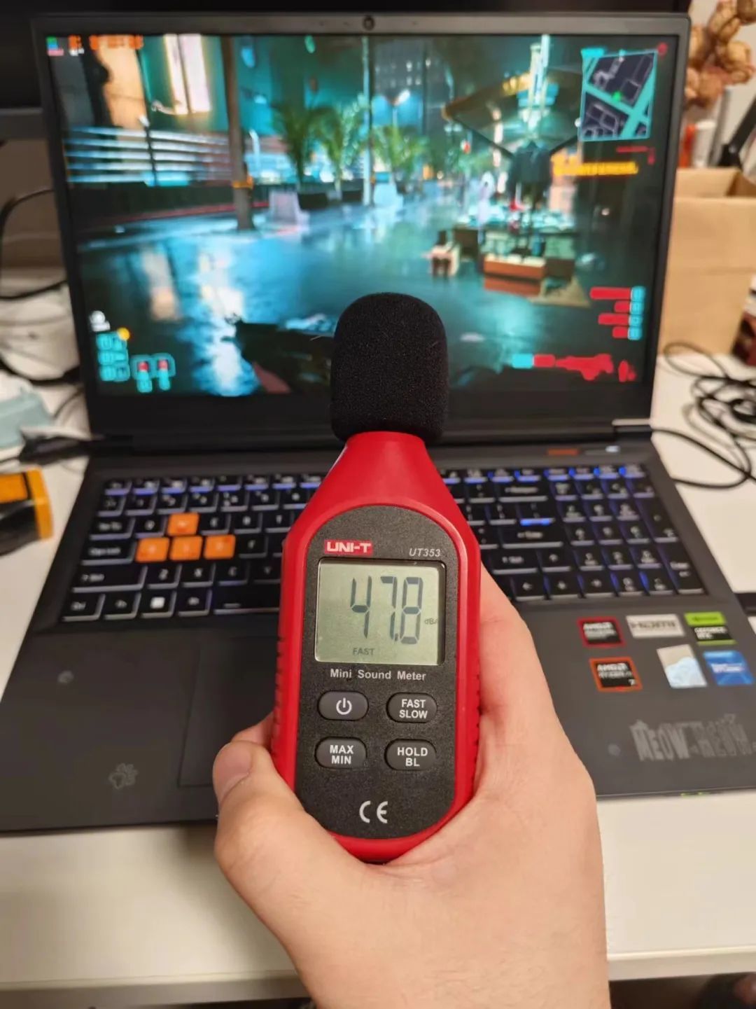 噪音降低至,47.8分贝 左右(环境噪音为40分贝),此时风扇噪音较低,甚至堪比部分轻薄本的噪音表现。