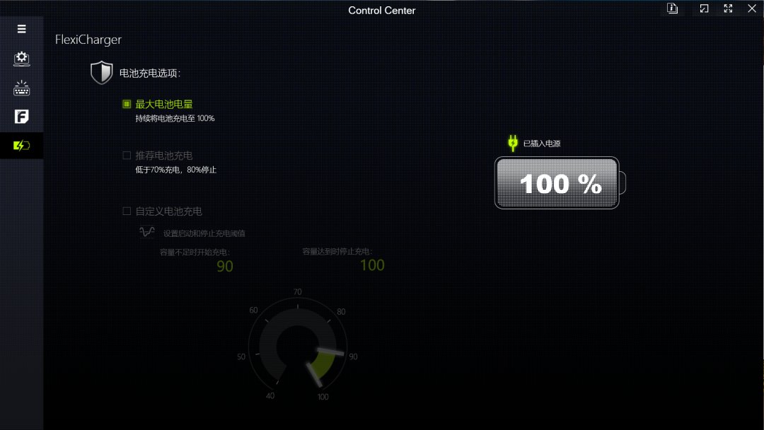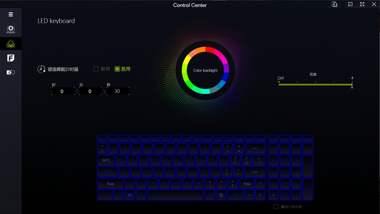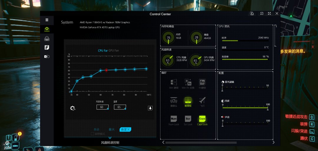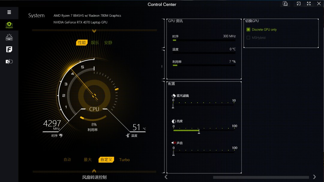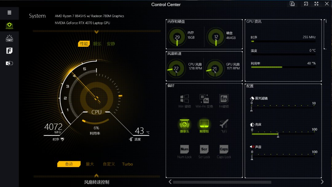 可调整设置运行模式(安静 省电 娱乐 性能),自定义风扇转速策略和键盘RGB灯效,调节屏幕亮度和声音大小。