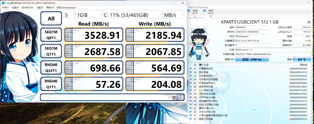 固态:512GB(PCIe 3.0, TLC颗粒)