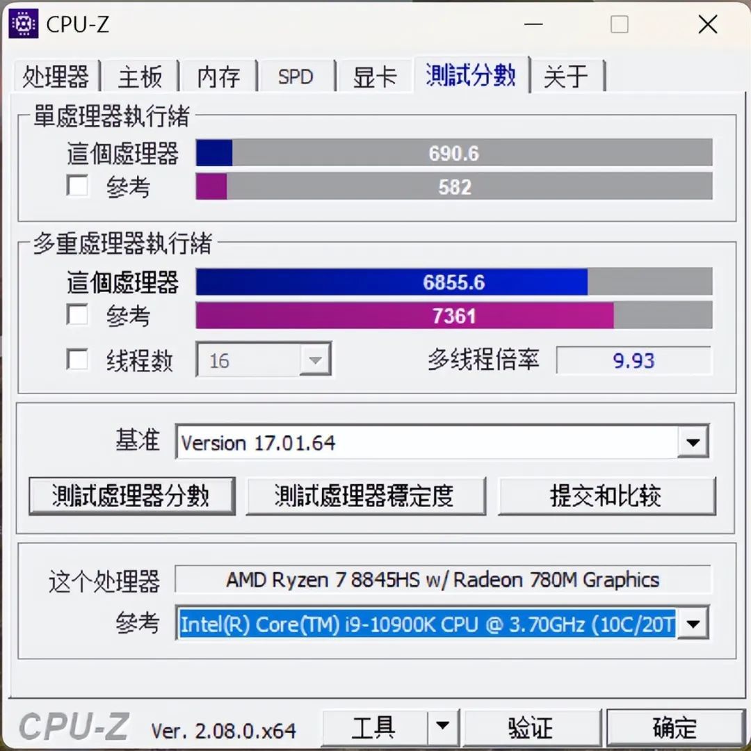 R7 8845HS ,CPU-Z 单核690 多核6855.6