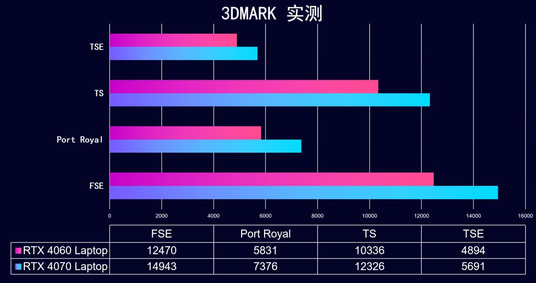 与之前测过的隐星P15 RTX 4060笔记本电脑显卡进行对比, COLORFIRE MEOW 橘宝 R15 RTX 4070 Time Spy分数领先 19%左右。