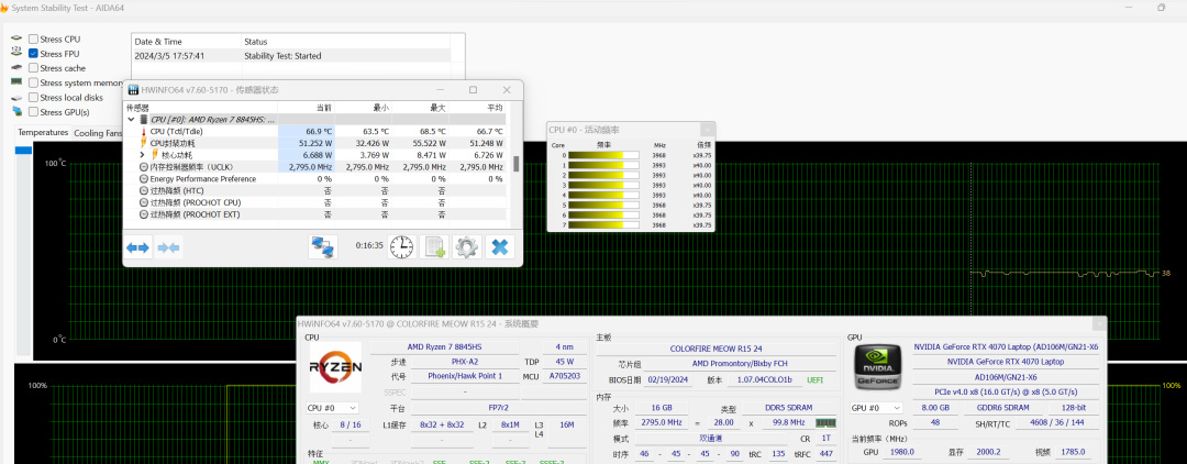 CPU频率 3.96GHz左右,温度66.9℃,功耗51W左右
