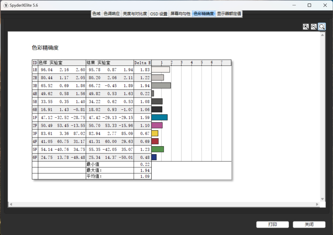 亮度最高360最低299,色准表现平均ΔE仅为1.09最大ΔE1.94