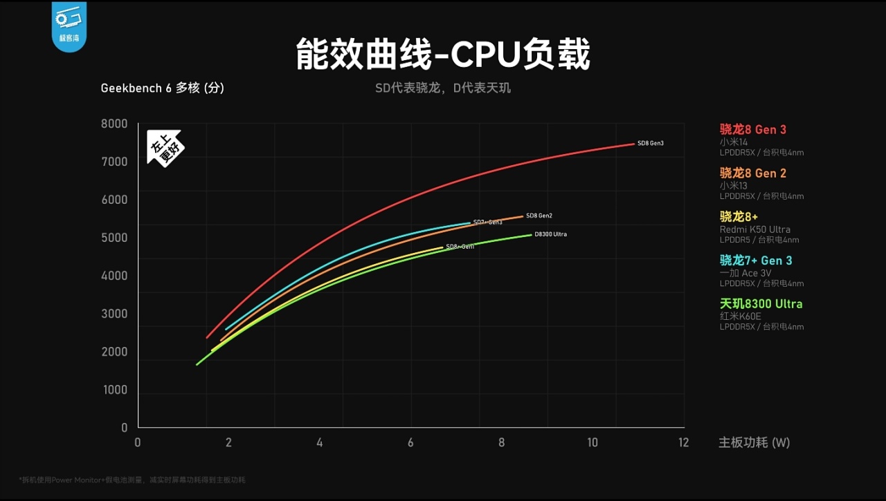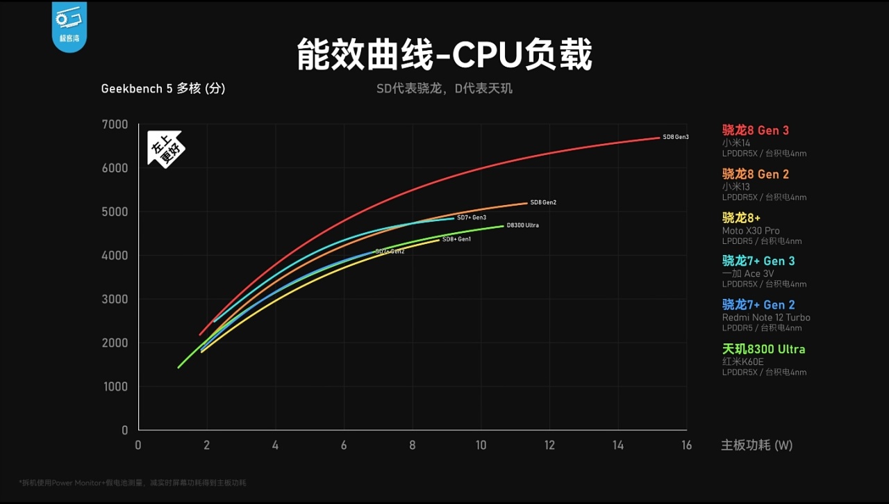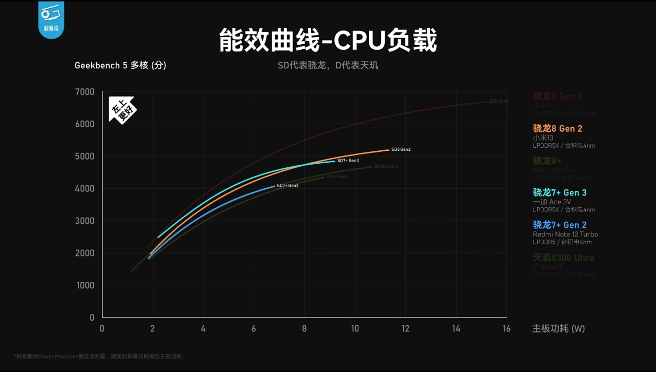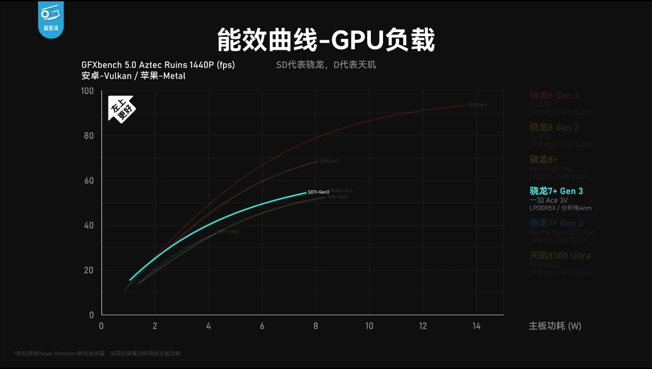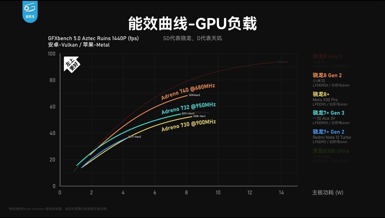 ——相较骁龙8+Gen1/骁龙7+Gen2,GPU能效全频段领先,基本持平天玑8300。