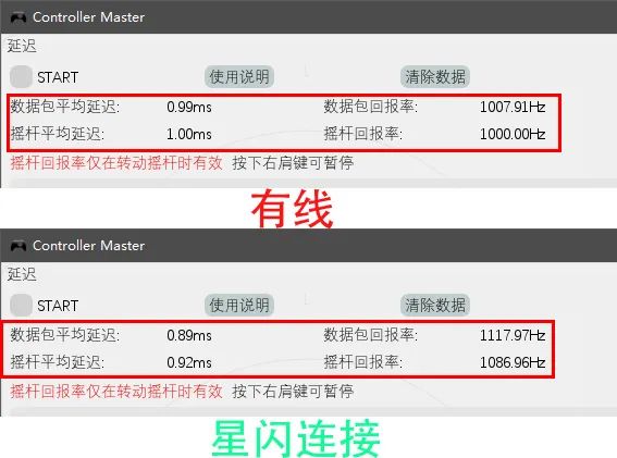 为了更直观了解北通星闪游戏手柄的性能,下面我们使用测试软件重点考察了手柄的摇杆回报率和延迟情况。在有线连接模式下,手柄的摇杆回报率就可以达到1000Hz,摇杆平均延迟为1ms。而在星闪无线连接模式下,手柄的摇杆回报率同样可以达到1000Hz,回报率和延迟甚至略好于有线连接,摇杆平均延迟不到1ms,要明显强于传统的2.4GHz连接。