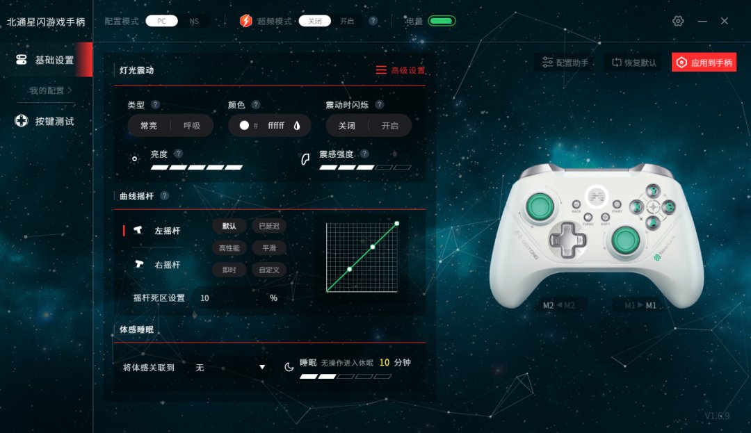 驱动方面,玩家可以下载PC端或者安卓端的“北通游戏厅”驱动,来对手柄的灯效、摇杆按键等进行配置。北通游戏厅的功能丰富,设置选项也很专业。在摇杆设置中,有6种摇杆灵敏度模式可以选择、自定义设置灵敏度曲线、设置摇杆死区等,并且每个按键都支持重映射,设置按键宏等自定义功能。