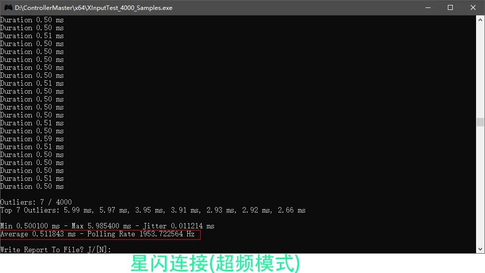 接下来,我们进入北通游戏厅开启手柄的超频模式,可以看到XInputTest测试软件里,使用星闪无线连接时其回报率已经达到了2000Hz水平,摇杆平均延迟为0.5ms左右,拥有2倍于有线连接的性能,表现非常优秀。在星闪无线连接技术、霍尔摇杆的以及北通算法优化的加持下,玩家可以轻松实现极为流畅无延迟的操控。