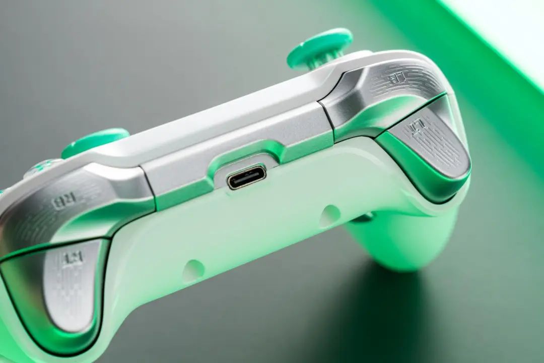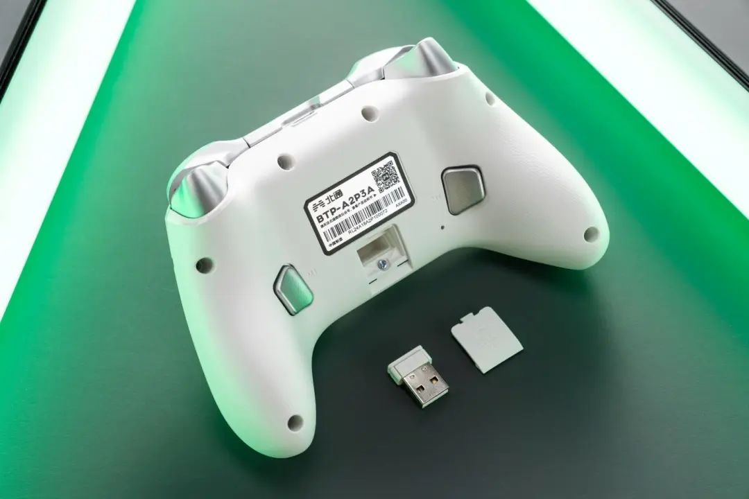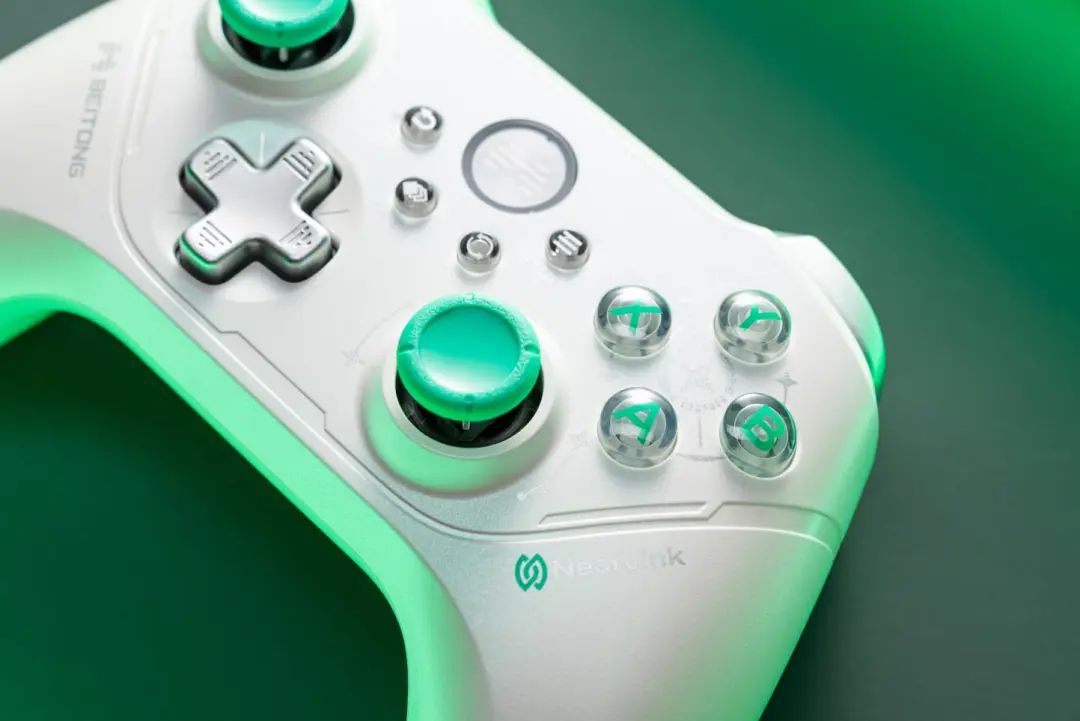 北通星闪游戏手柄基于北通阿修罗2 Pro+平台而打造,因此在造型外观方面两者几乎一致。不过北通星闪游戏手柄采用的是“限定版”的白绿配色,手柄的上盖表面采用了五重幻变涂层工艺,在不同角度和光线下会呈现粉绿渐变的色彩,同时还可以看出细腻的珠光效果。配合摇杆和按键字符上的“星闪绿”点缀,形成了独具特色的视觉效果。其他细节方面,在十字键ABXY按键周围有专属的装饰图案,个性十足。