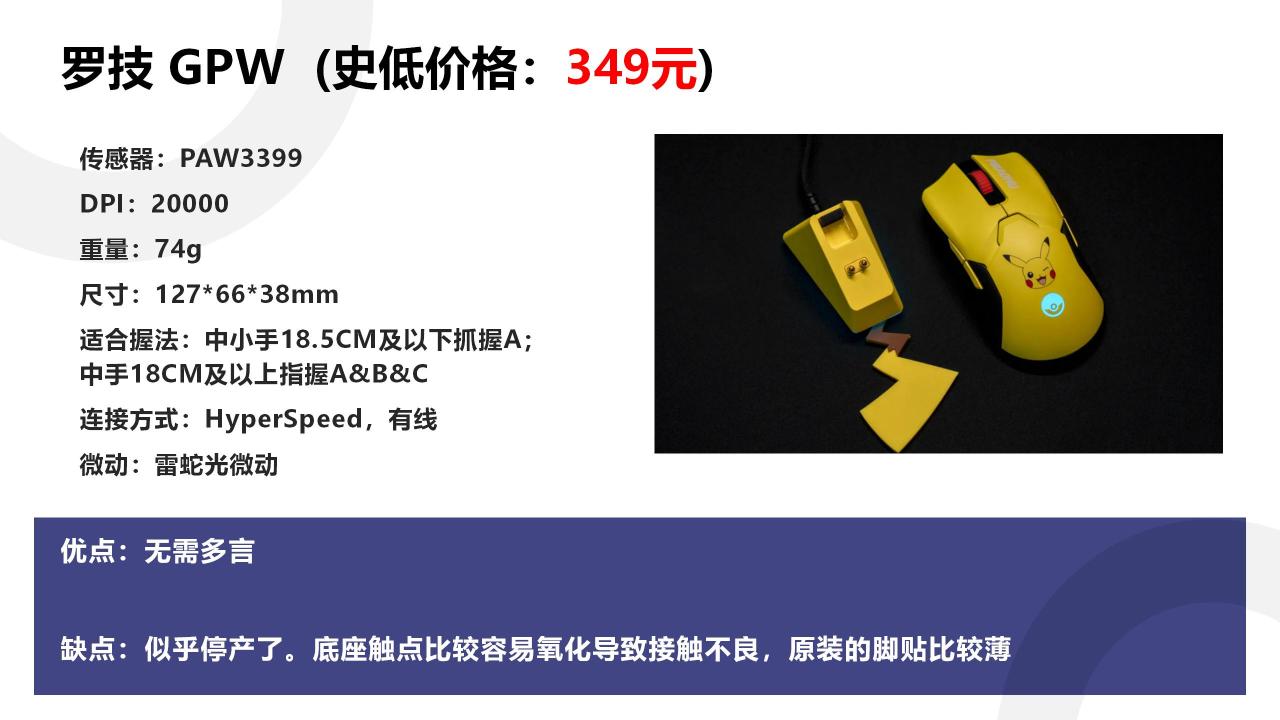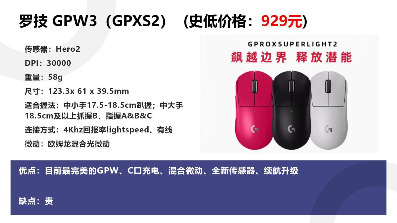 最后是GPW3,为什么我现在只推荐GPW3呢。目前狗1差不多是300,狗2 600,狗3 900。基本上这三款鼠标就是300块一档的差价。