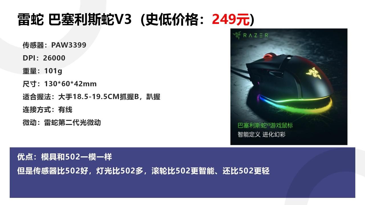 但我再说一次,巴塞利斯蛇V3相比现在的G502,有更酷炫的光效,更智能的滚轮,更轻的重量,更优秀的传感器。所以,不要总是想着G502了。不妨考虑一下巴蛇V3,这也是一款很不错的选择。