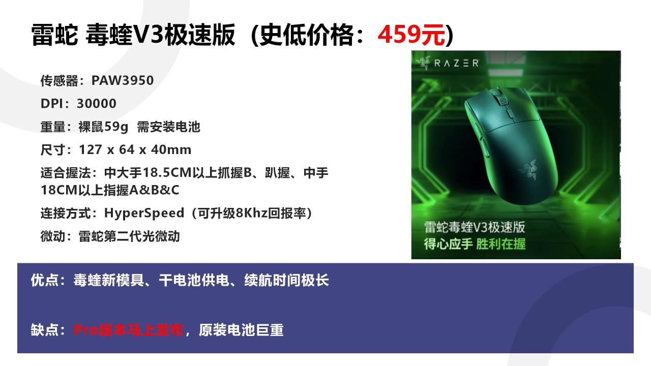 类蝰蛇V3磨具,3325传感器,1000Hz回报率,80小时续航,重量95g。