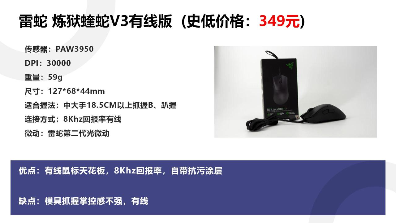 分别是蝰蛇V3的有线版,你别看它是有线版,但它和无线版一样用的是3950顶级传感器,而且默认就支持8Khz回报率,重量还比无线版轻4g,而且表面还有抗污涂层。这些都是无线版没有的,可以说只要你不介意有线,这就目前有线鼠标的版本答案。