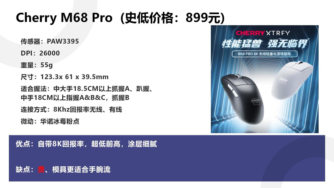 首先是Cherry M68Pro,这是最近的一个新品鼠标。他出厂就支持无线8Khz回报率,这是目前非常少见的。