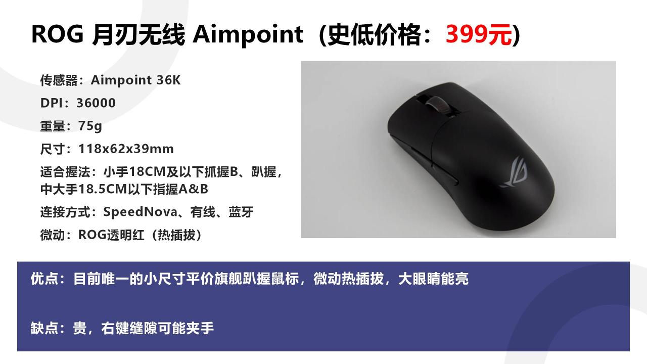 ROG在这个价位还有一款月刃AP,是目前市场上少有的小手趴握旗舰游戏鼠标,虽然定语很多,但它确实是唯一。月刃AP和刚才的影刃3无线版都支持热插拔微动功能,拧两个螺丝就能换鼠标微动,可玩性挺高的。
