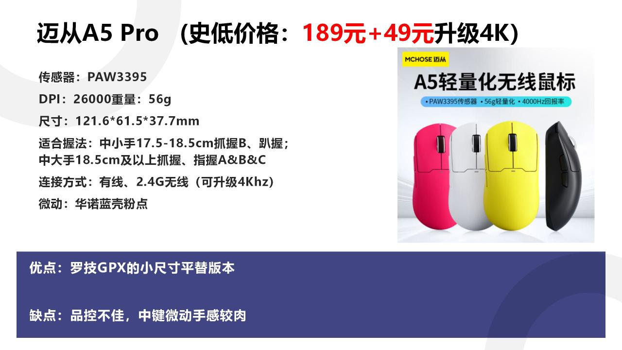 最后则是GPW的平替,那便是迈从A5 ,模具尺寸要比GPX略小一点,但总体手感非常类似 。而且+ 49元能升级到4Khz回报率。