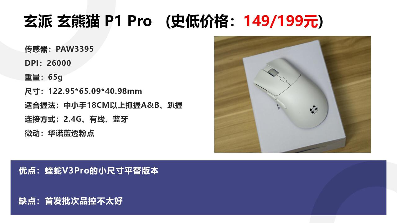 首先推荐的是玄派的玄熊猫P1,你可以把它当成雷蛇 蝰蛇V3Pro的小平替,模具和握感都都非常像,只是鼠标尺寸要比蝰蛇V3小一点。觉得蝰蛇V3有些大的朋友,可以看下这款。